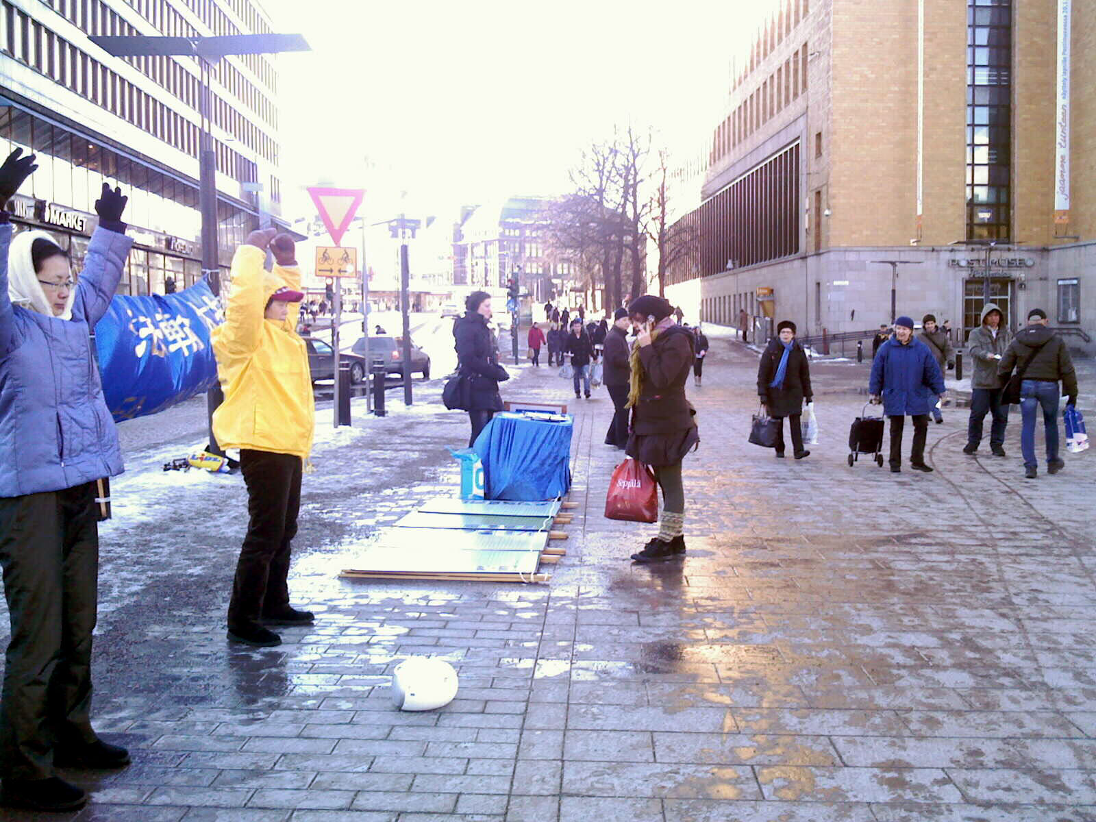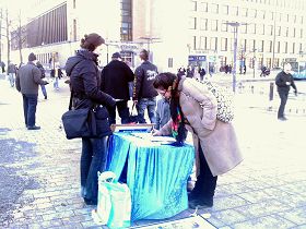 【明慧网二零一一年三月七日】二零一一年三月六日,芬兰首都赫尔辛基的天气仍然异常寒冷,当天的风特别的大,中午十二点,法轮功学员在火车站广场拉起了横幅,摆放了揭露中共用各种酷刑迫害法轮功学员的展板。匆匆走过的人们停下脚步,询问详情,明白真相的人们纷纷在制止迫害的征签簿上签名,有很多路人直接走过来说:“我知道什么是法轮功,我要签名。”
