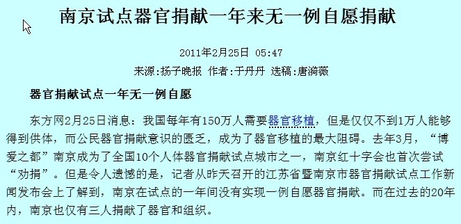 二零一零年三月,中共卫生部与中国红十字会在天津、辽宁、上海、南京等十省市启动为期一年的人体器官捐献试点,“就人体器官捐献的招募、获取和分配进行全面探索。”然而一年后,《扬子晚报》对南京全年零器官捐献的报导再次提醒人们正视这段血色历史和至今仍在持续的罪恶。