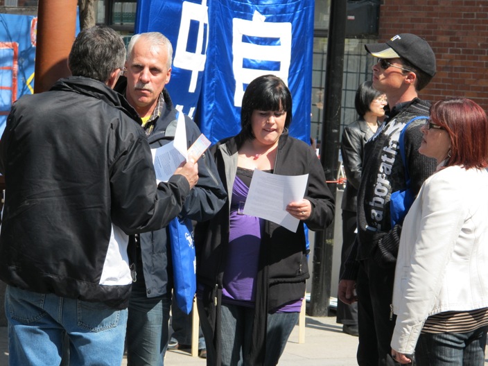 曾经在国内因被剥夺房产而联合上访被恐吓将被抓捕的甲女士,为逃离恶运移民加拿大,今天一直在集会现场,退!党!服务中心的义工李女士与她谈了很久。开始她对中共的做法非常无奈,经退!党!义工李女士耐心地交谈,她明白了退出中共是为自己好,当场退出曾经入过的中共恶党的团、队组织,并表示回去要天天默念“法轮大法好,真善忍好”。