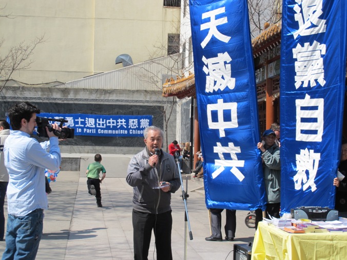年逾古稀的电气工程师张力,年轻时曾经是中共早期地下党员,后受到过中共迫害。张力先生用广东话向过往的民众传达了中国民众觉醒的信息,讲述了自己的亲身经历,呼吁人们早日摆脱中共邪灵的控制,为自己的未来着想,退出中共。
