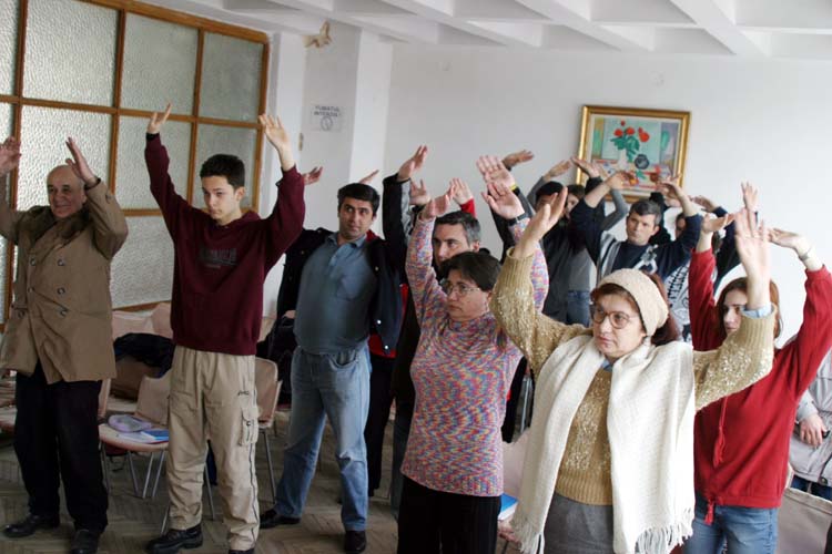 ![]() 罗马尼亚的土尔努•瑟维林城(Turnu Severin)民众学习法轮功第二套功法 |