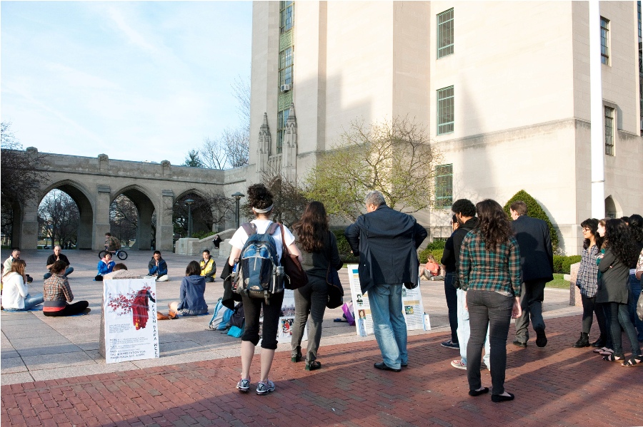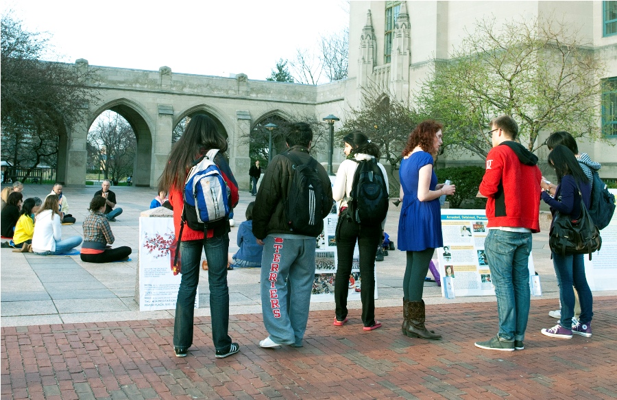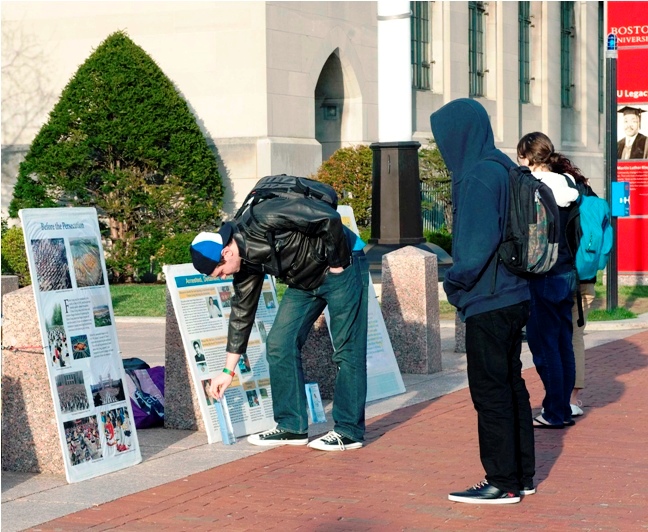 ![]() 波士顿大学国际特赦学生卡茨(左四)拿着传单告诉人们法轮功真相 | ![]() 人们驻足观看真相展板 |