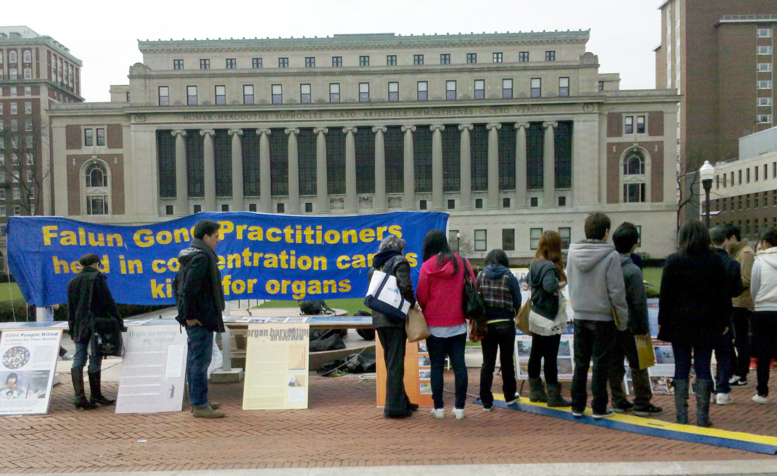 哥伦比亚大学是美国著名的常青藤学府,始建于一七五四年,位于纽约曼哈顿哈德逊河畔。真相展设在大学校园内的最佳视野处,一进大学校门,就可以看到硕大的英文横幅“法轮功学员被关押在集中营,器官被摘取”和一幅幅大型真相展板。展览分为法轮大法简介、迫害真相和《·九·评*共产党》三部份。