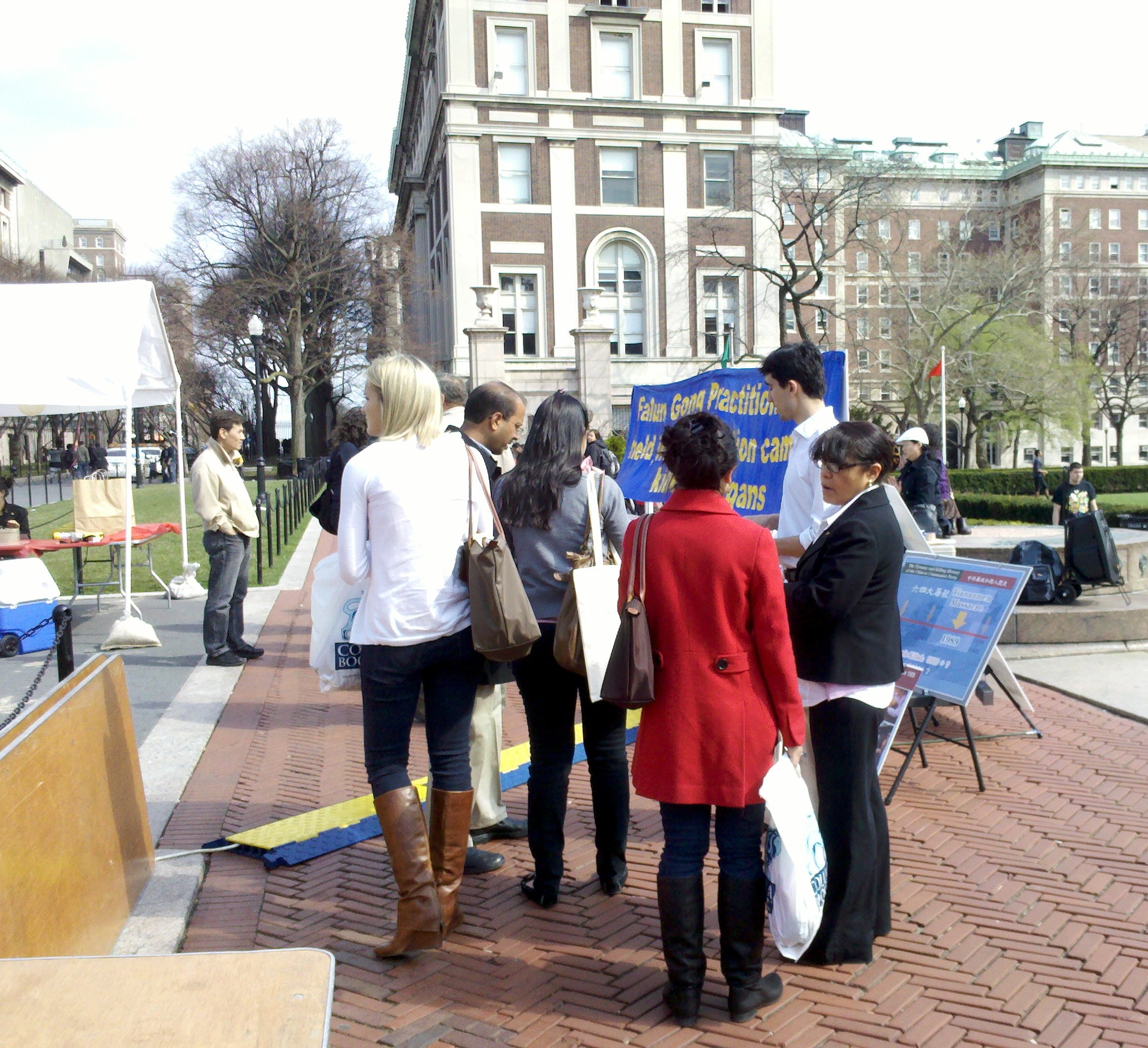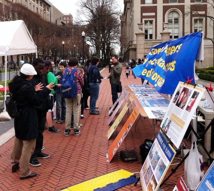 ![]() 哥伦比亚大学校园里的法轮功真相展吸引了很多师生 |
