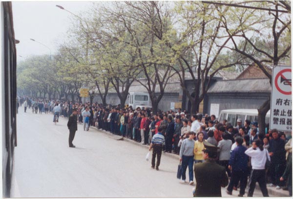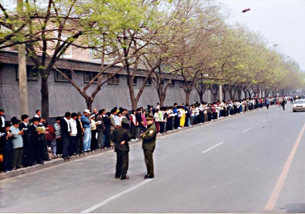 一位北京法轮功学员回忆说:他是四月二十五日早晨八点来到府右街南口,和几位同行的法轮功学员沿着府右街东侧的人行道向北街走,想直接去国务院西门找接待站反映情况,离西门还有三四百米时,见从路西的上访的人群里走出来一位素不相识的少女对他们微笑着说:“请问你们是来上访的同修吗?”他怕她是阻拦上访的就没说话,同行的一位法轮功学员说了句:“我们是某某区的,来上访的。”这位少女说:“那就站到那边的上访队伍中去吧!”这位北京的法轮功学员说:“我们是去国务院信访接待站向政府反映情况,不是来站队的。”那位少女说:“我知道你的心情,咱们来到这儿就是一个整体,来的目的都是一样的,咱们有同一个师父同修一个法,要顾全大法和整体的形象,别让坏人钻空子。”这位北京的法轮功学员听了,连声赞同的说“对、对”,便随着这位少女溶入路边上访的队伍中站立等候。