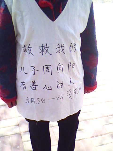 警察不理老太太,叫下一个人办手续,老太太很伤心,跟他们讲理也不听,无奈,老太太穿上了白布做的大坎肩,上边写着:“我儿子生命垂危,港北监狱不让父母见,我儿子是好人。”