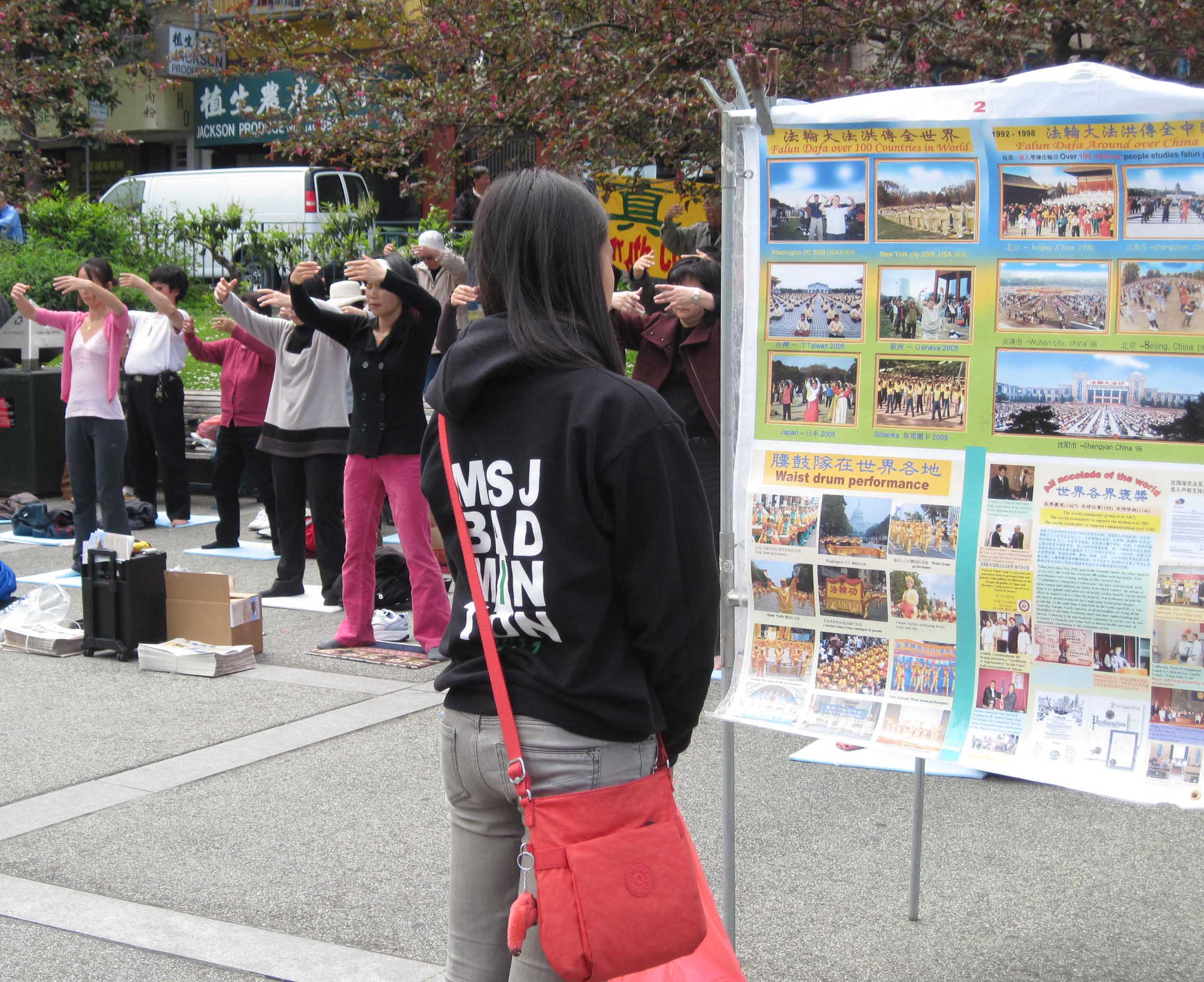 自今年年初以来,旧金山湾区法轮功学员坚持每周到花园角广场炼功、发正念、讲真相。让越来越多的民众进一步了解这十多年来,发生在法轮功学员身上的真实故事。不少当地的民众陆续来法轮功学员的炼功点学功。