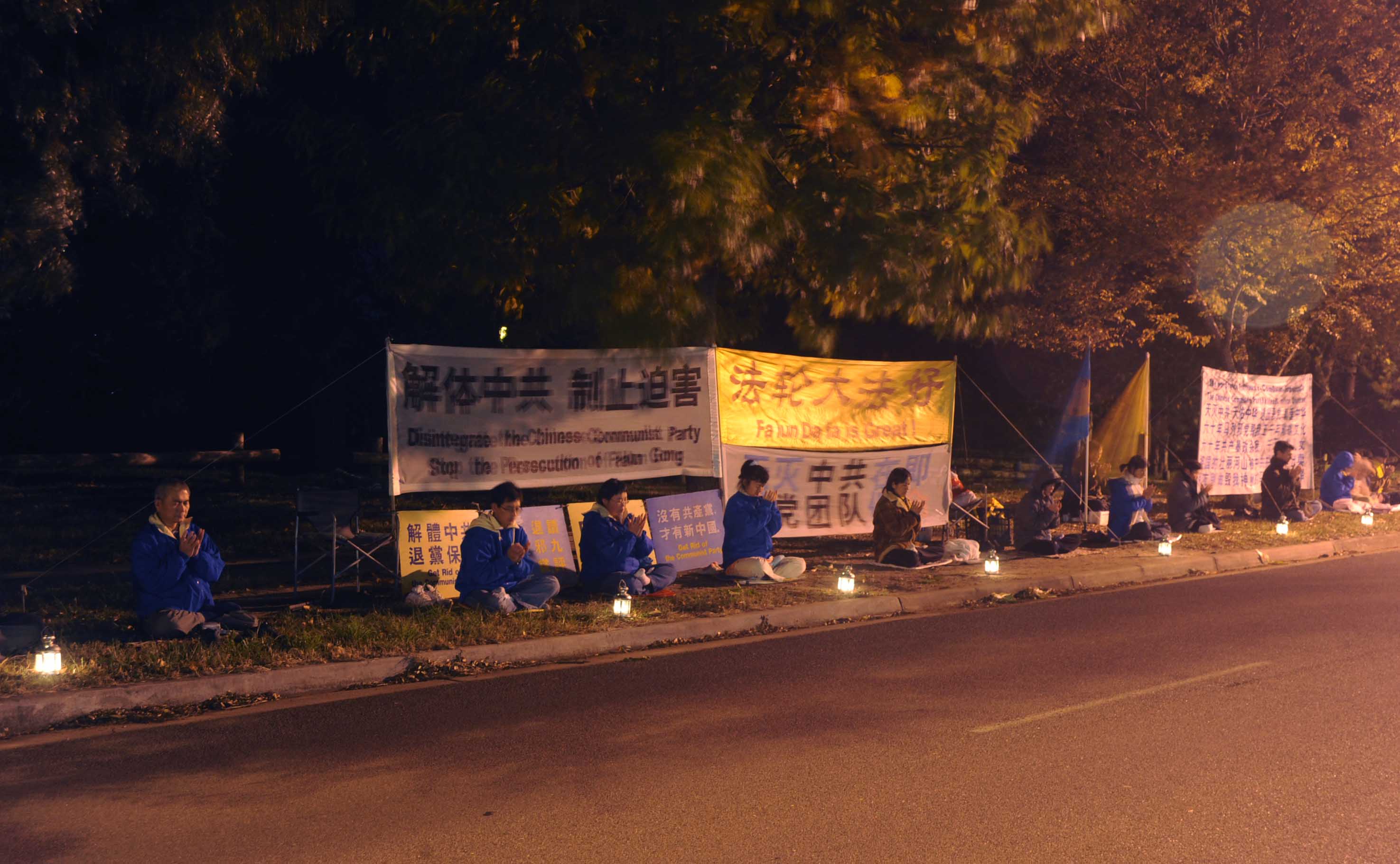 学员们在路旁展开了“法轮大法好”和“解体中共 制止迫害”等横幅,并且摆出了许多真相展板,向过路的游人展示法轮大法的美好和揭露中共的恶行,呼吁他们和法轮功学员一起共同制止迫害。