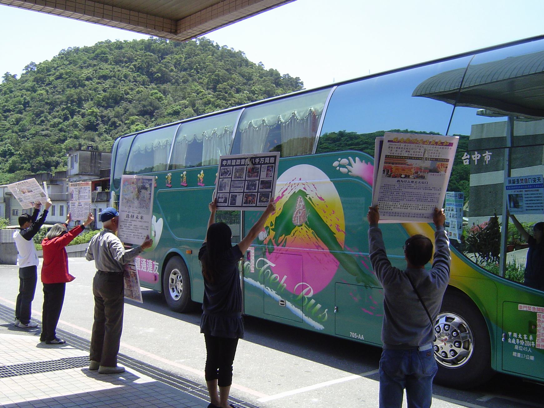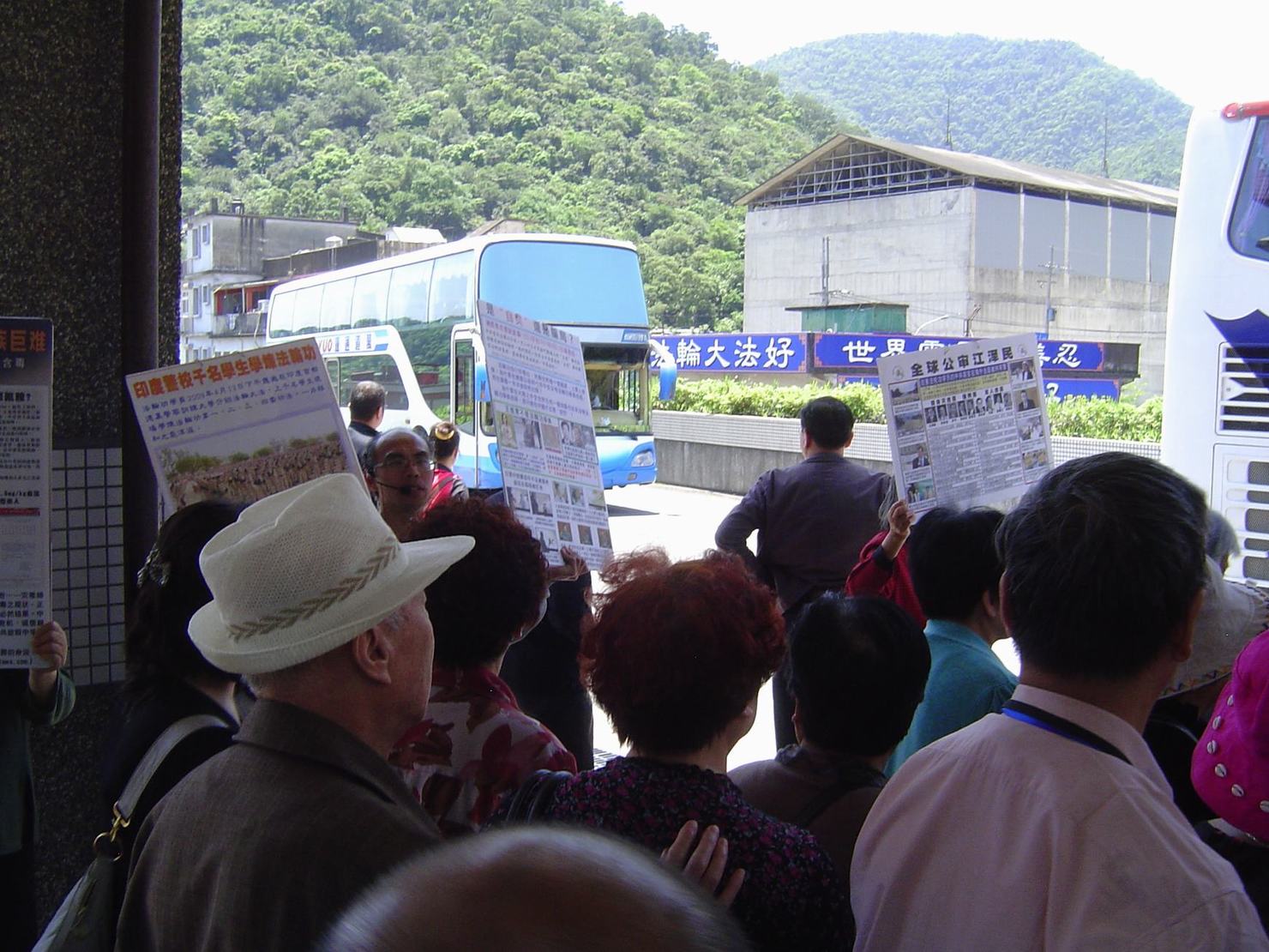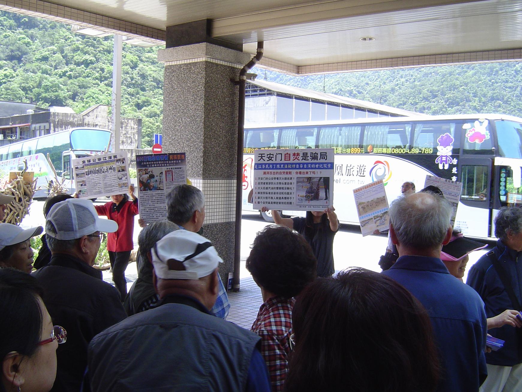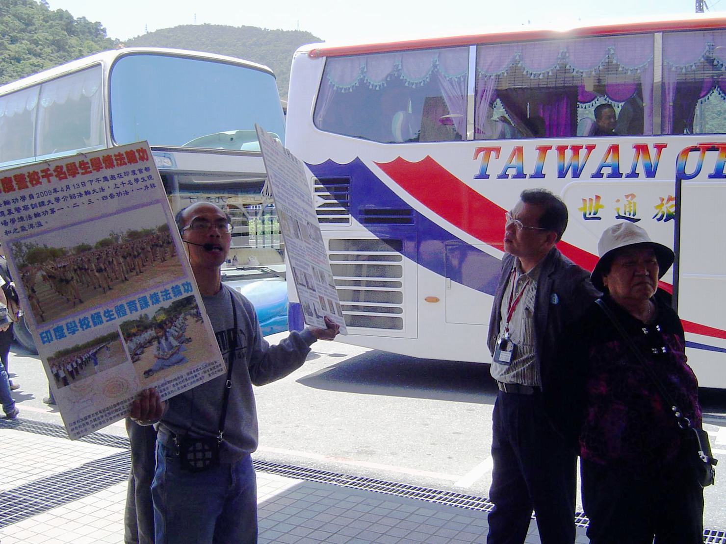 ![]() 法轮功学员在中国游客等候游览车之处,传递真相信息 |