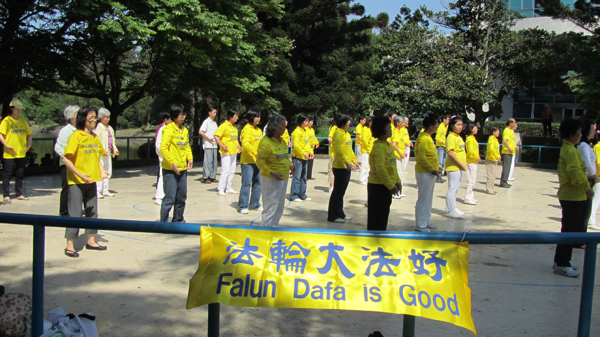 下午,在优美的成功湖畔,清华大学、交通大学的法轮功学员以及部份新竹县市地区学员联合展示一至四套法轮大法功法。蔚蓝的天空下金黄的法轮大法T恤衫显的格外亮丽,舒缓的功法,伴随着悦耳的炼功音乐,交融成一幅绿水、蓝天、黄衫的画面,十分动人,加之校园的清纯气息,让人犹如置身世外桃源。