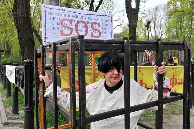 各种横幅展板上揭露中共的暴行,并呼吁各界共同制止发生在中国的这场浩劫。现场还以模拟酷刑展的方式告诉人们中共在过去十二年里是如何残酷折磨坚信“真、善、忍”的法轮功修炼者的。