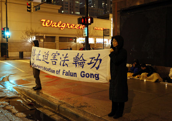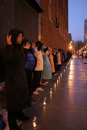 ![]() 芝加哥法轮功学员在中领馆前以烛光守夜纪念“四•二五” |