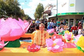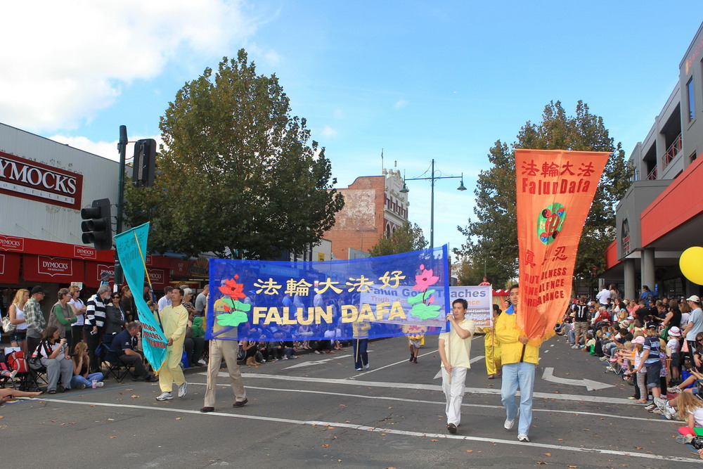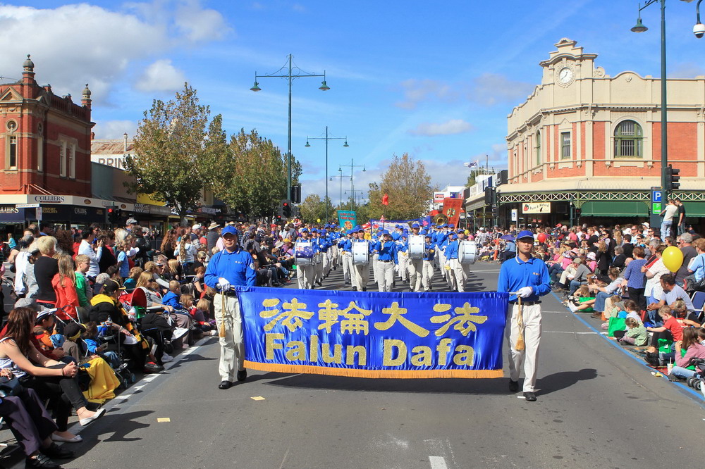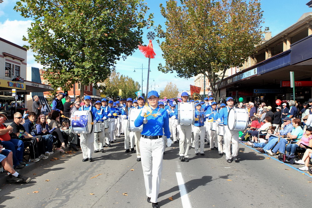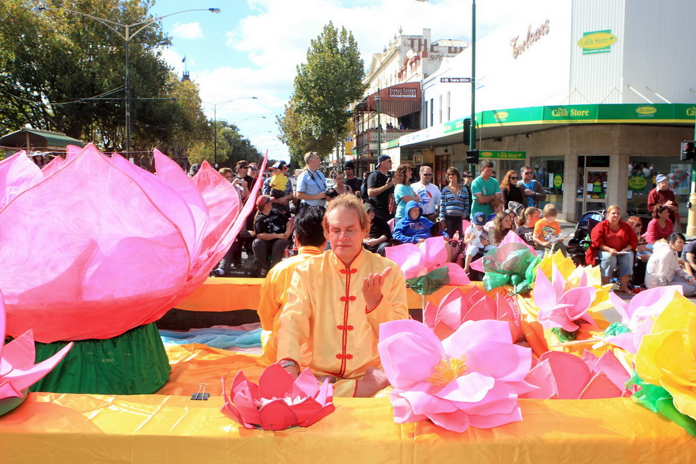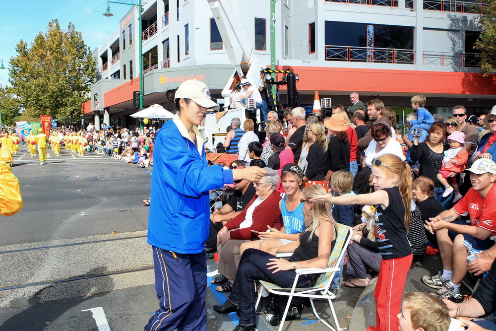 游行中,来自墨尔本的法轮功队伍,壮观祥和,与舞龙舞狮的热闹场面形成鲜明对比。不同年龄层的学员们(最大七十多岁、最小只有几岁)身着优雅华贵的古装,由威风凛凛的大型军乐队天国乐团作前导,祥和的功法表演、优美的扇子舞和高雅的唐装舞、带有浓厚民间情趣的腰鼓队紧随其后,尽显中国传统文化的富饶。慈悲之曲回荡在法轮功队伍游行所经之处,两旁的观众感受着大法的美妙与殊胜,由衷赞叹,纷纷接受法轮大法真相资料。