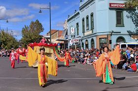 跟着庆典的节拍,漫步于古都之上,历史的一页依稀展现在眼前。十九世纪清朝末年,随着澳大利亚淘金热传及中国之后,怀着淘金梦的一批中国人漂洋过海,于一八五四年踏上了澳洲著名淘金地之一的班迪戈,成为了当地社区的重要一员。据说当年来班迪戈的华人就有二千人。从那时起中国人同班迪戈一同经历了百年历史的风霜,与当地人一同构建了这美丽的城市。看着那游行队伍中身着唐装的西人,不禁感叹中国传统文化的博大精深在哪里都可以扣动其他民族的心弦;看着那道路两盘的古老中国庙宇更能感受一代代华人对祖先故土的思念。