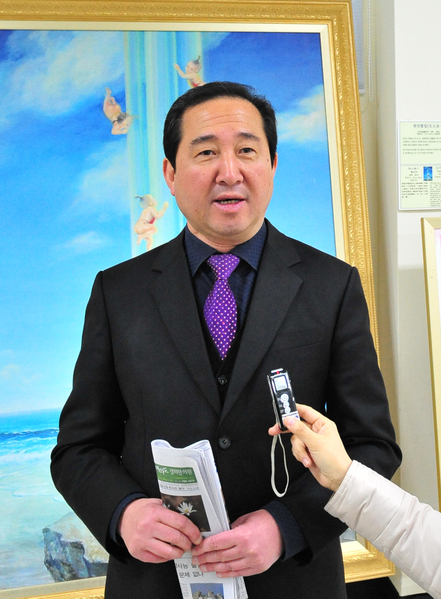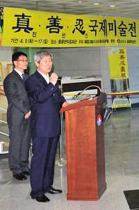 韩国法轮大法学会会长权洪大在开幕致辞中表示,这些美术作品的画家都是法轮功修炼者,其中有的画家就象张昆仑教授,他在中国直接经历了残酷的迫害。通过美术展我们向世人呼吁帮助这些修炼者,并尽快制止中共对法轮功修炼者的残酷迫害。他还表示,通过“真善忍国际美展”,我们希望能够给善良的郁陵岛居民们带来美好,希望更多的岛民们来观看美术展。