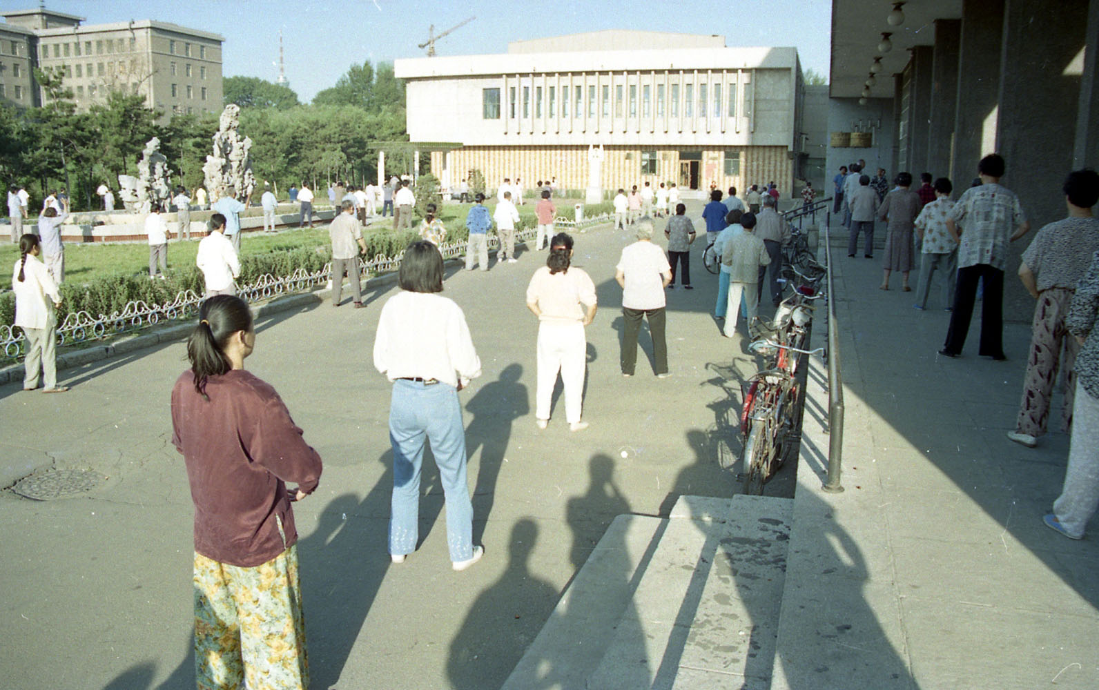 一九九三年六月二十六日,在第六期班开始的前一天,师父在吉林大学礼堂举行了一次报告会,当时社会上叫“带功报告”。记的当时是两块钱一张票,那天上午,礼堂里坐满了人,也就是有一千六百人。为了使大家能够接受,师父用初期最通俗浅白的语言,以气功的形式概括性的给大家讲法,让大家知道法轮佛法修炼,不落下一个有缘人。报告结束后,师父与吉林大学法轮功学员在科技楼门前合影。
