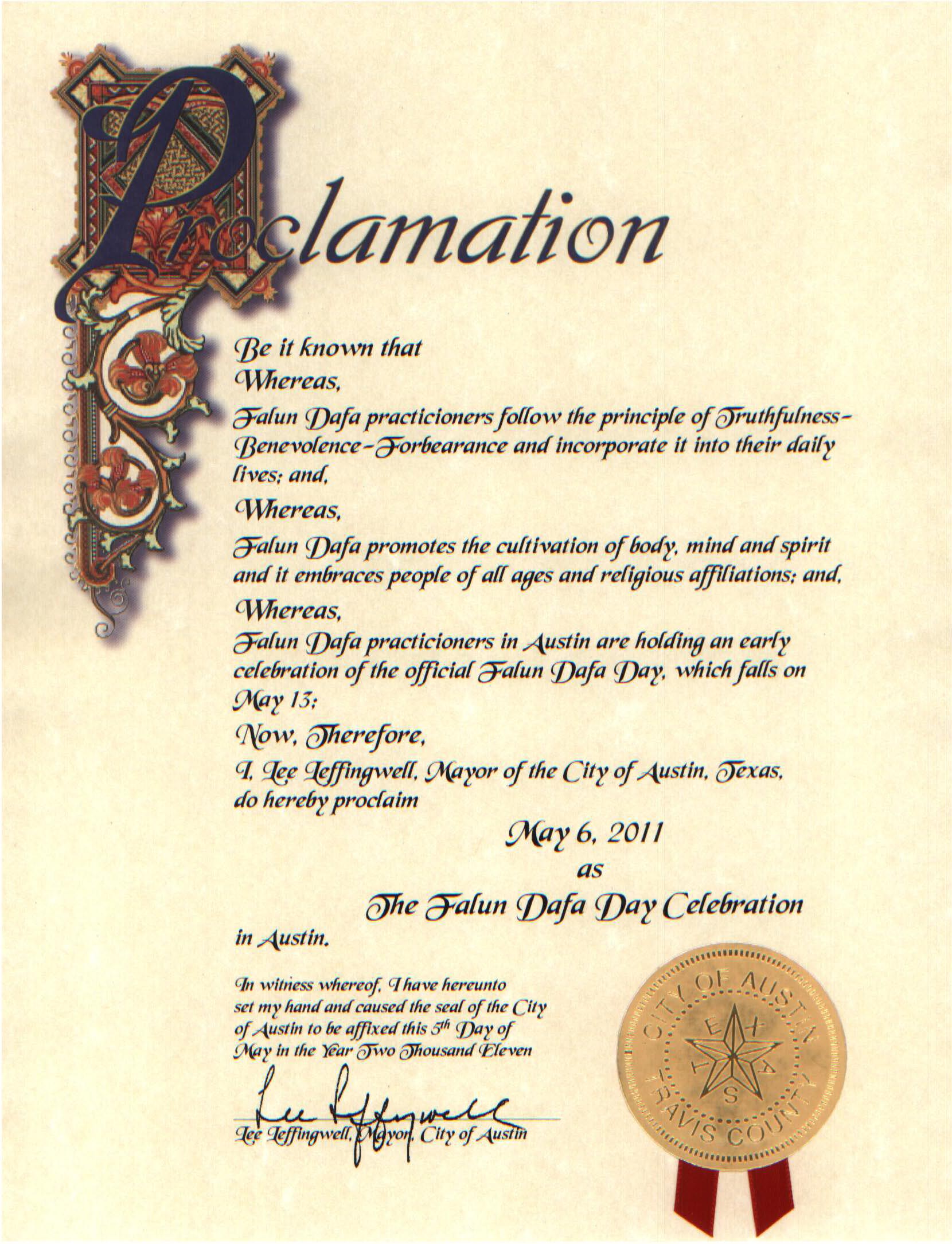 鉴于,奥斯汀市的法轮大法学员提前庆祝法轮大法日。法轮大法日是五月十三日。