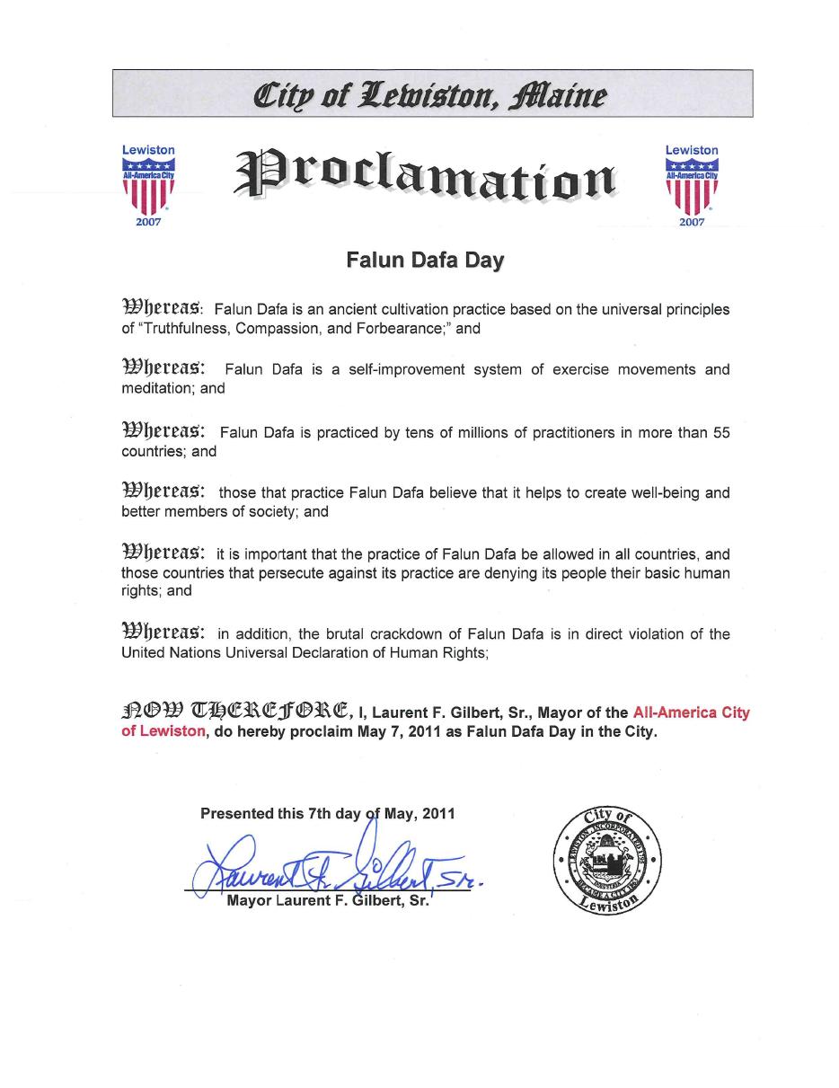 因此现在,我,劳伦.老吉尔伯特,全美城市刘易斯顿市市长,特此宣布二零一一年五月七日为该市法轮大法日。