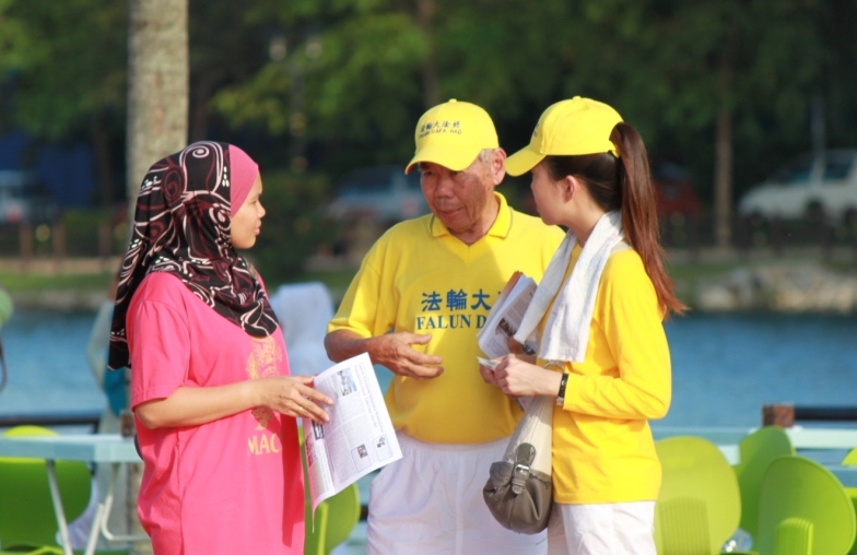 ![]() 来自吉隆坡武吉加里尔的法轮功学员朱福(中)在活动中正在跟民众讲真相 |