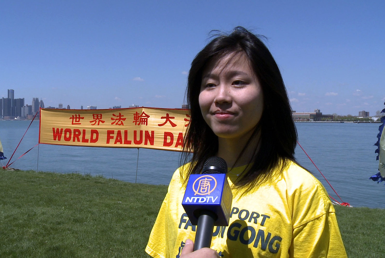 正在密西根大学读书的年轻学子簫冠瑜说:“我其实从六、七岁的时候就跟着父母亲每年参加这个庆祝活动,差不多也有十年了。后来渐渐长大,懂事后,就更加深刻理解这一日的意义和重要。今天,我们除了来这里庆祝大法日,展示大法的美好,更重要的是,我们住在美国很幸运,可以这样大大方方的举办这样的活动,而在中国大陆的法轮功学员们是没有这样的机会的,我们在这里也是代表他们,让更多的美国人了解法轮大法的真相,了解中国大陆的法轮功的情况,得到更多人的帮助。”