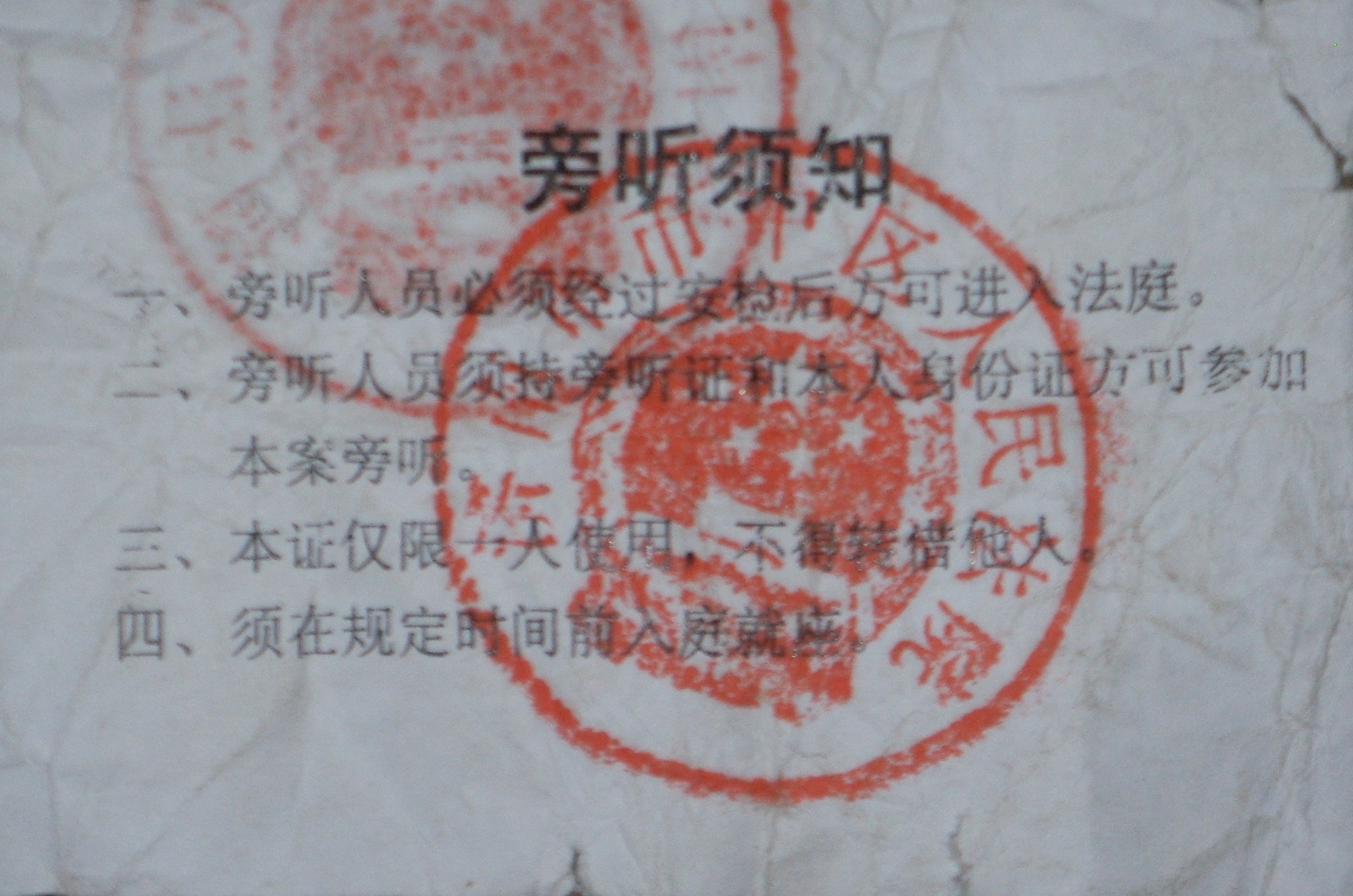 可是,次日开庭以前,尽管田凤玉持有旁听证,却不让进入法庭,而女儿田广青却因为没有旁听证,也被拒之门外。因此,田凤玉和女儿,不得不站在法院门口,直到最后。期间,女儿田广青多次要求进入法院,法院的工作人员含含糊糊,说不出具体的规定是什么,因为这期间一直有“便衣”在观察田广青的举动,但最终田广青也未能进入法院旁听。