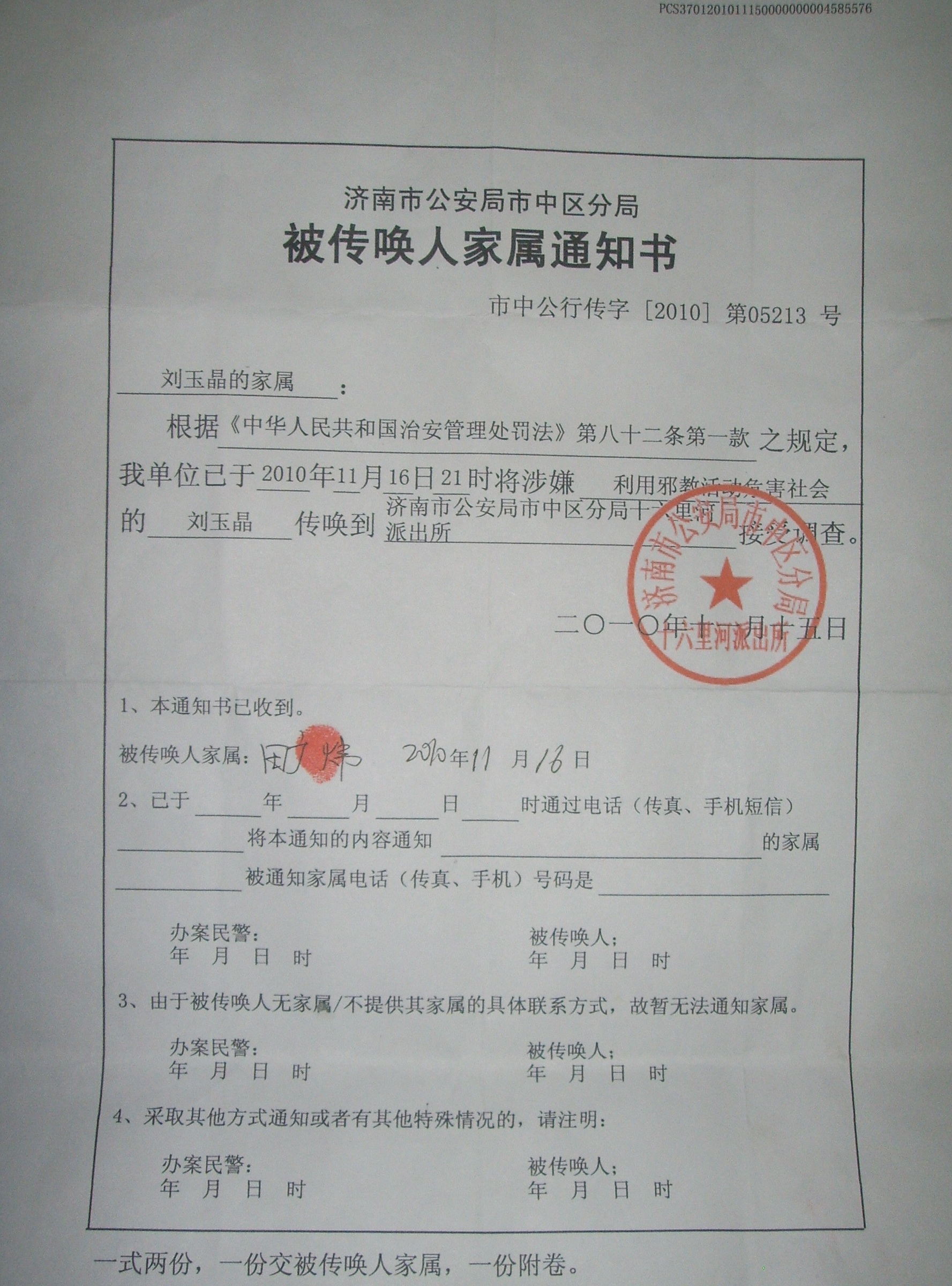 刘玉晶,是山东省济南市市中区兴隆村的善良农妇,她的丈夫和女儿都是安分正直的好人。二零一零年十一月十六日,刘玉晶从家中被绑架到十六里河派出所,家中被抄。十一月十七日,刘玉晶被非法刑事拘留,关押到济南市看守所。十二月二日,刘玉晶被非法批捕之后,济南市市中区中共法院定于二零一零年五月六日非法开庭审理。