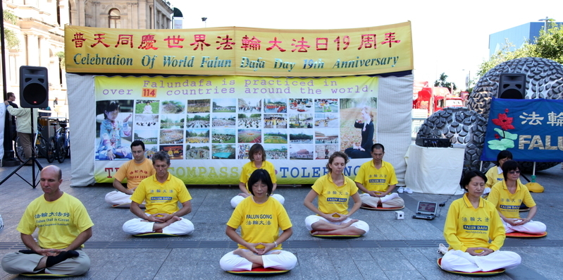 每年的世界法轮大法日对法轮功学员们而言是一个相当特殊和重要的日子。今年是法轮大法弘传世界十九周年,同时也是创始人李洪志先生六十岁生日,学员们共同庆祝这意义非凡的盛会。除了布里斯本当地的学员外,还有来自黄金海岸、阳光海岸、以及特地乘坐飞机前来参加活动的凯恩斯(Cairns)和佩斯(Perth)学员们。