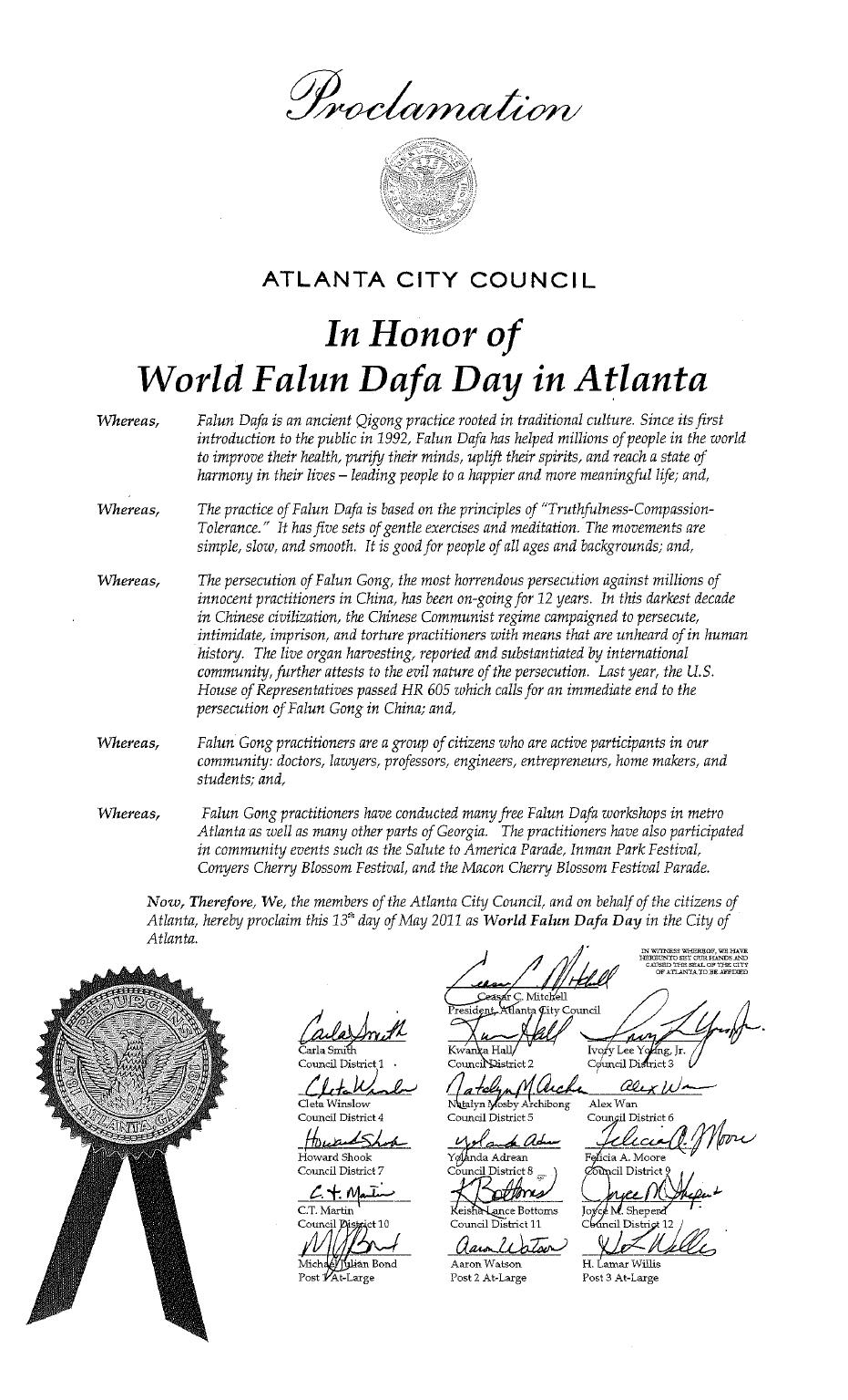 因此,乔治亚州亚特兰大市议会全体议员特此颁发褒奖,表彰法轮大法,并宣布二零一一年五月十三日为:亚特兰大世界法轮大法日