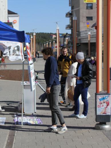 母亲节的今天,金昭宇在芬兰北部ROVANIEMI市中心街道再次呼吁大家关注母亲陈真萍,并展示了法轮功学员为了坚持自己的信仰被中共关押和迫害的母亲们,路过的行人纷纷停住脚步认真的观看展示图和资料。