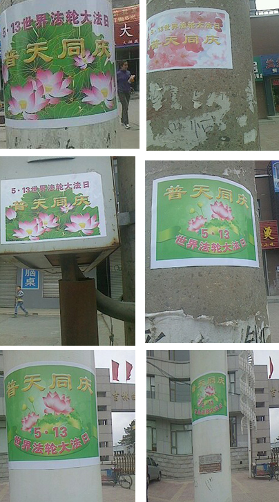 通讯员吉林省报道)吉林省某市大法弟子为恭贺师尊生日并祝贺“5·13世界法轮大法日”,于2011年5月10日晚,在城市的大街小巷贴满了“普天同庆5·13世界法轮大法日”的不干胶。翌日清晨,道旁的电线杆、灯柱、电话亭、商铺墙面、树干等处随处可见精美的不干胶图片,为这个初春的小城增添了一抹靓丽的风景,使邪恶胆寒,众生欣喜。