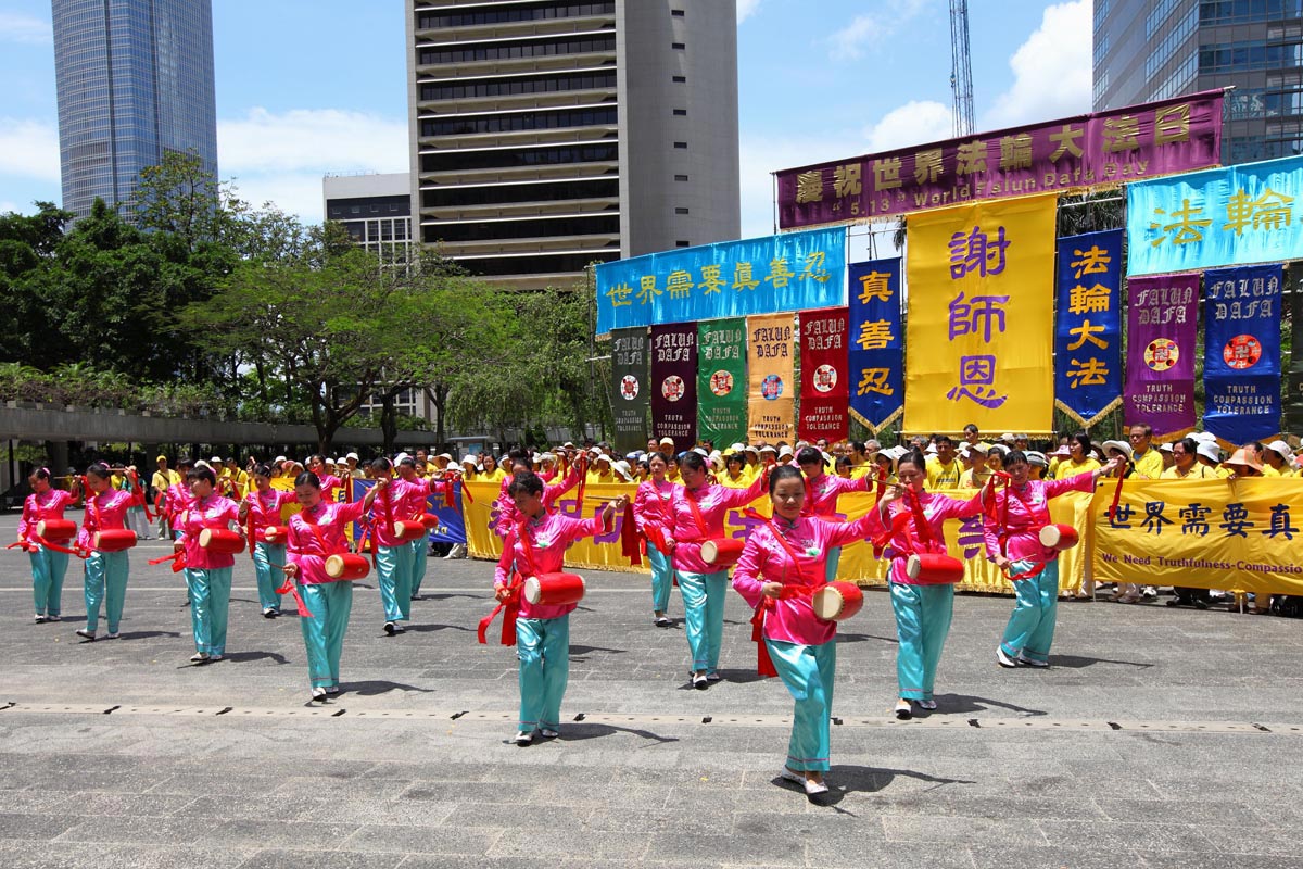 中午时分,游行队伍抵达终点的遮打花园。学员们稍作休整,便展开压轴的庆祝活动。在天国乐团及腰鼓队先后向师尊献上节日及生日的恭贺后,学员全体合十,多次齐声高呼:“恭祝师父生日快乐!”
