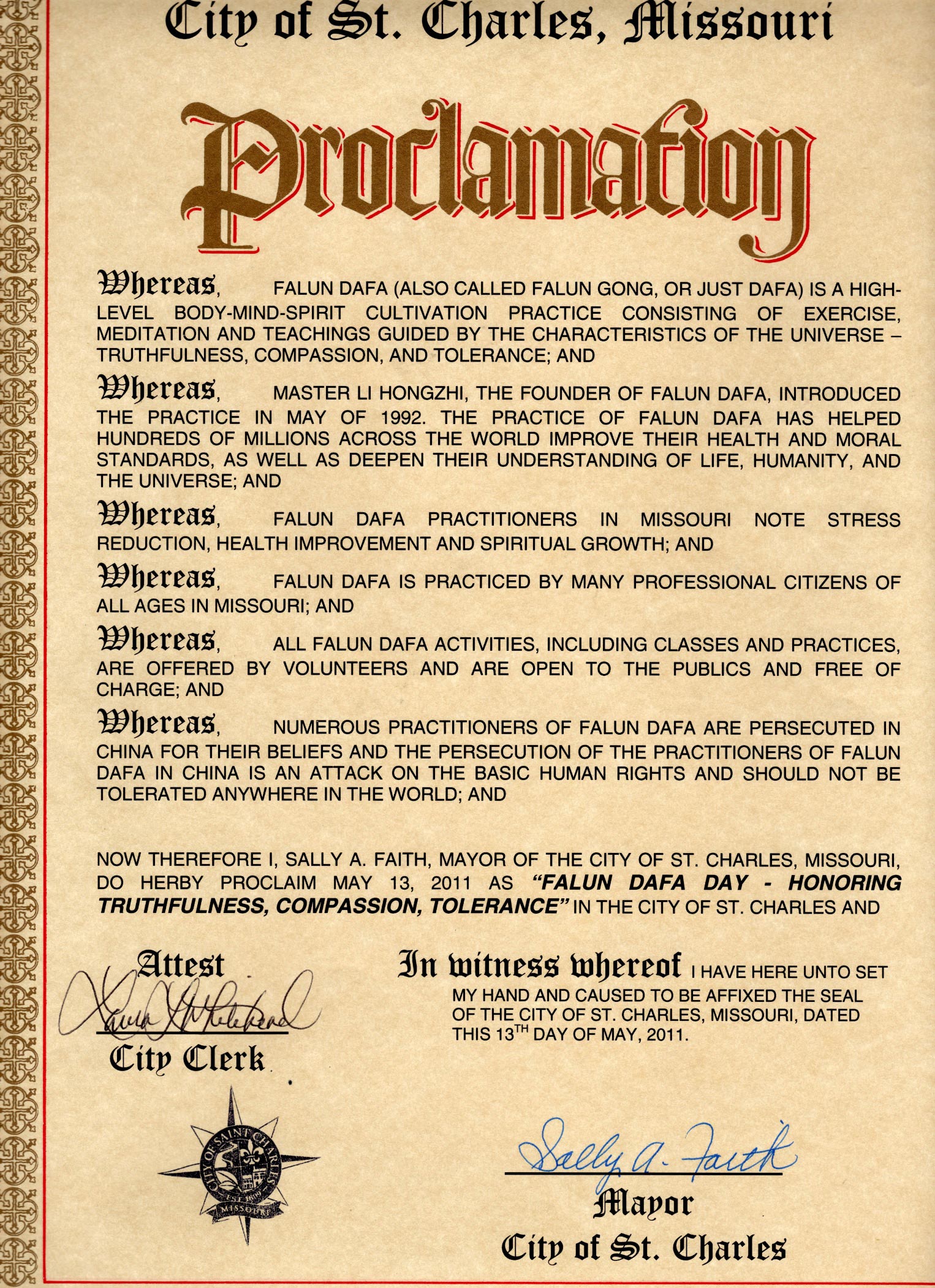 鉴此,我,密苏里州圣查尔斯市(St. Charles)市长莎莉·费斯(Sally A. Faith),特此宣告二零一一年五月十三日为