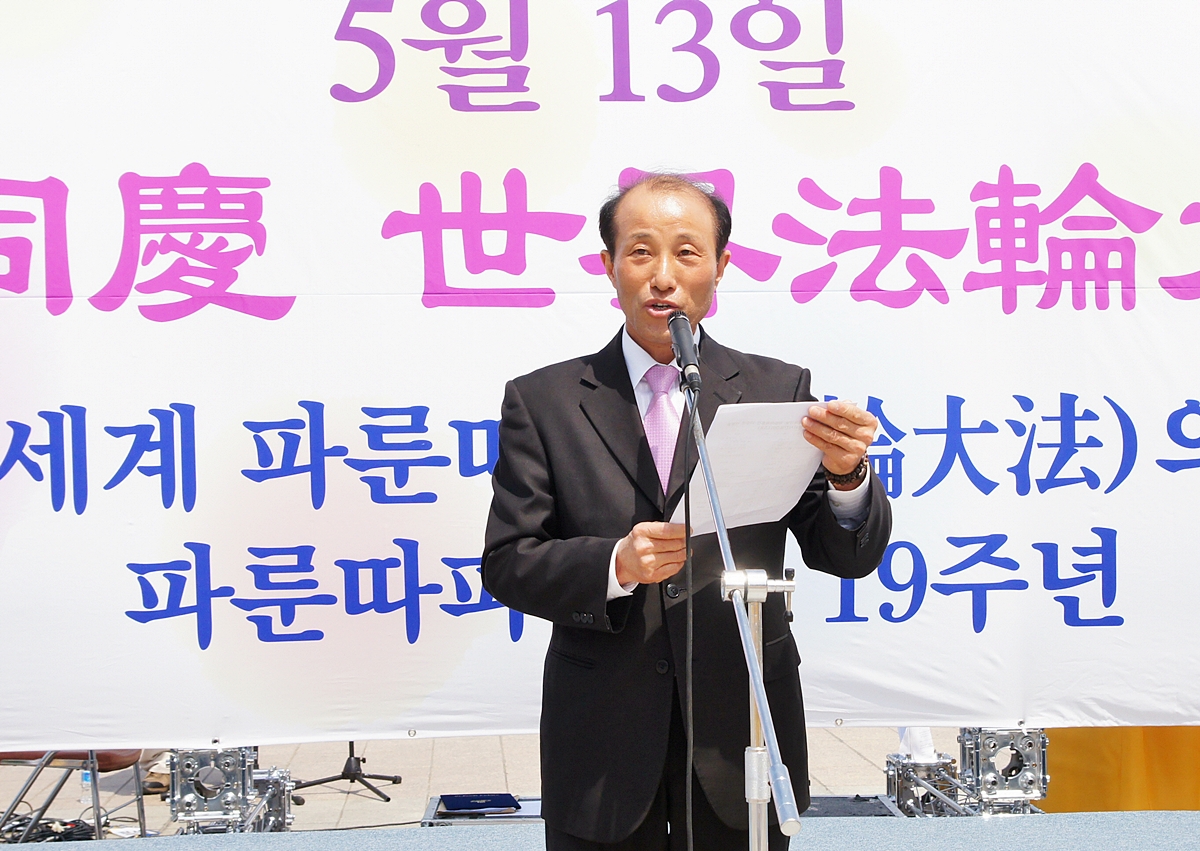 韩国自由联盟总裁朴昌达(音译)发表祝辞说:“祝贺增进身心健康的法轮大法洪传十九周年,希望中共对法轮功的迫害能早一天结束。”韩国宗教特别委员会会长李春燮(音译)先生代读了朴总裁的贺词,朴总裁表示“保障个人信仰是人类普世真理”,并对法轮功学员们不辞劳苦讲真相表示感谢。