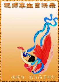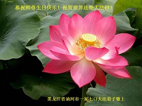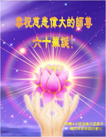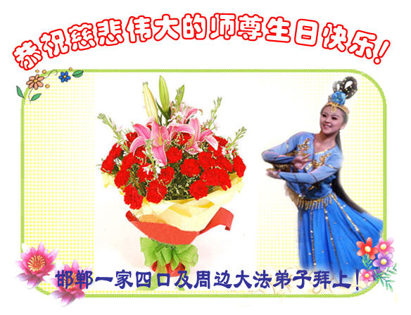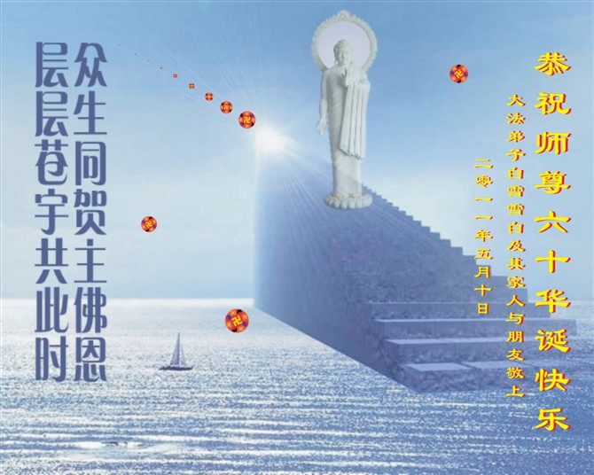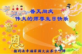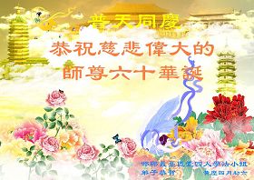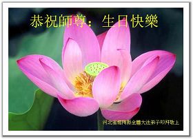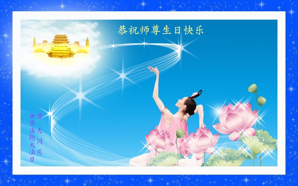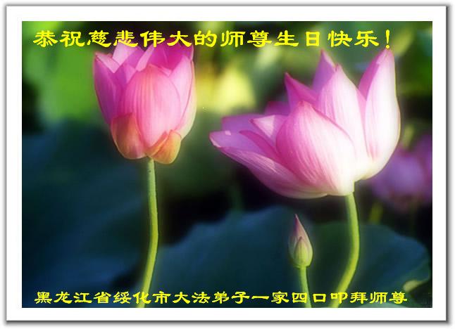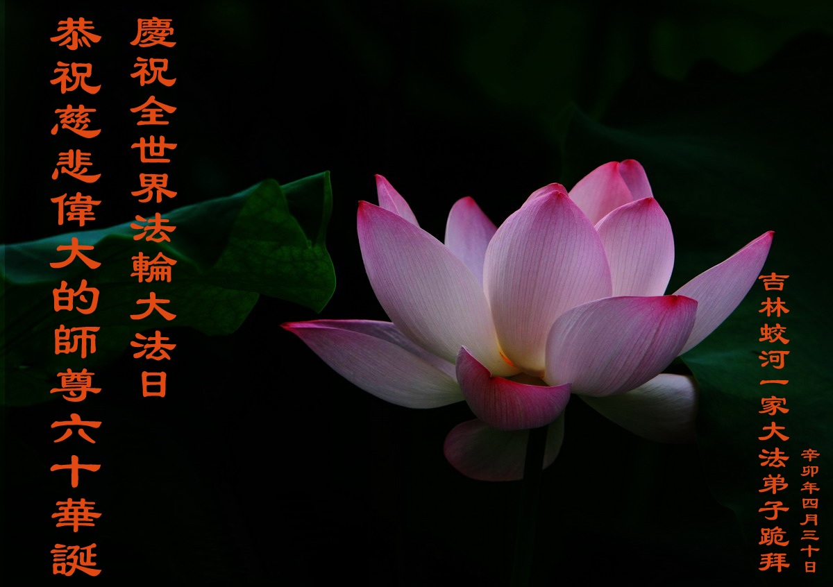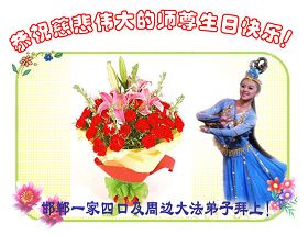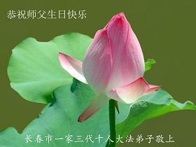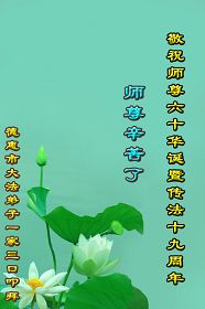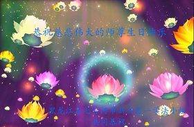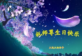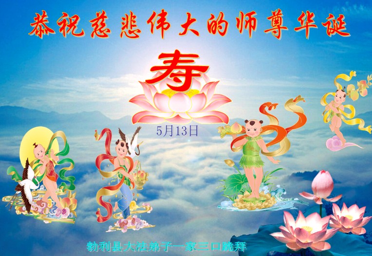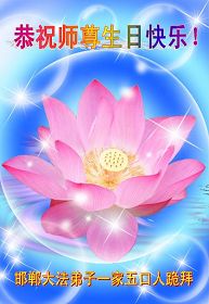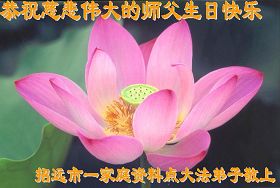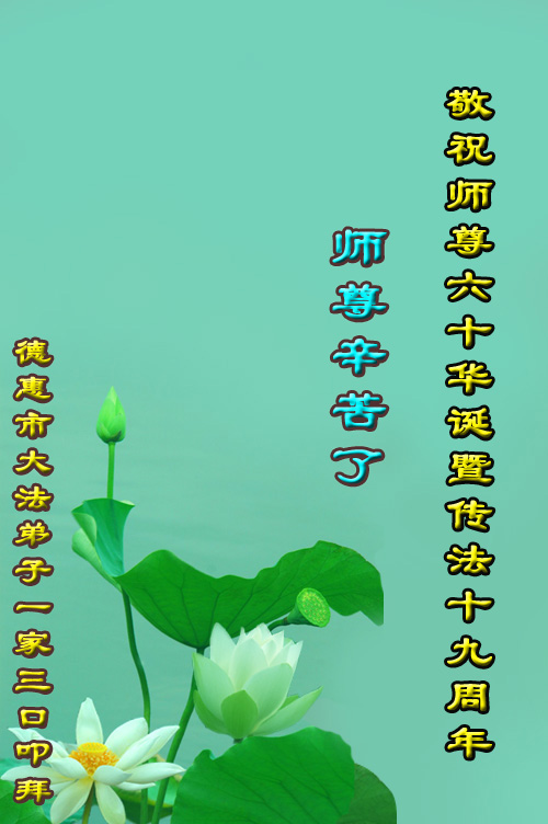 在师尊六十华诞即将到来之际,我和家人同修向慈悲伟大的师尊叩拜:祝师尊生日快乐!愿师尊多欣慰、少操劳。在这个特殊的历史时期,我们能成为您的弟子,与师尊同在,与正法同在,我们有多么的幸运,有多么的荣耀。我们无法用语言来表达对师尊慈悲救度的感恩!我们只有加倍努力,做好“三件事”,做好正法时期大法弟子应尽的责任与使命,勇猛精進,才不辜负师尊慈悲苦度。