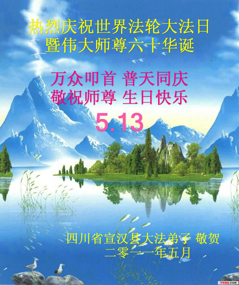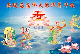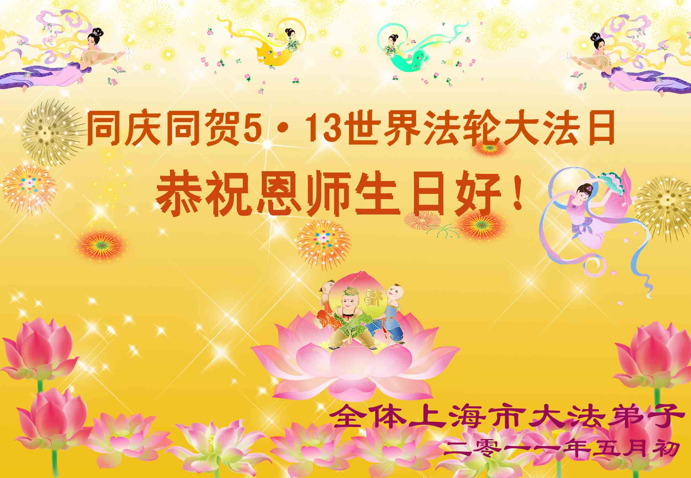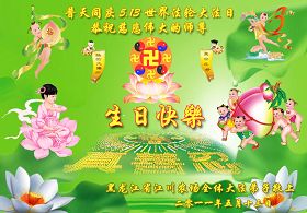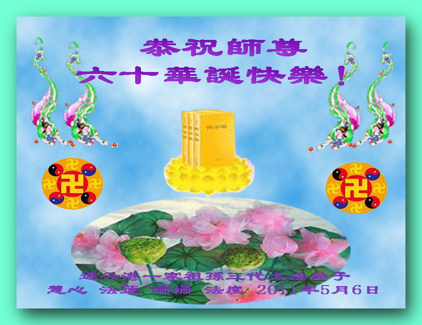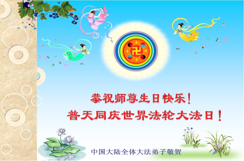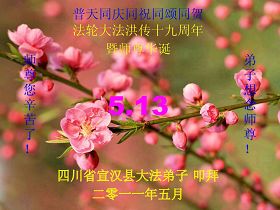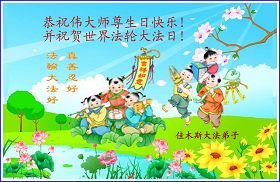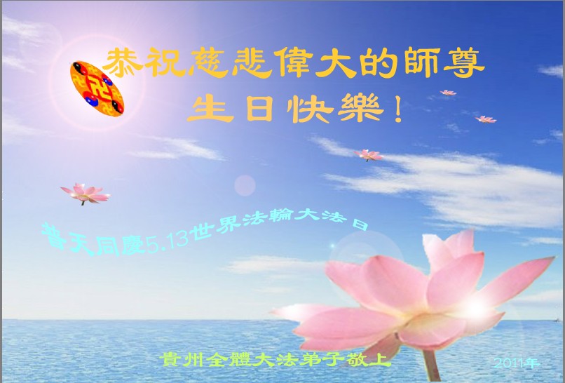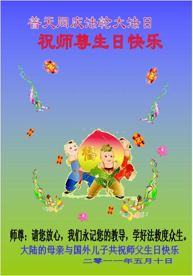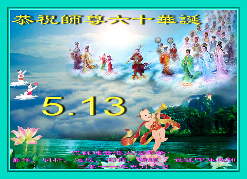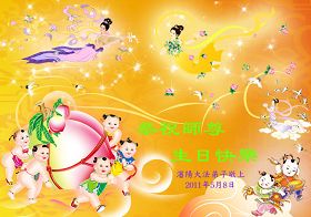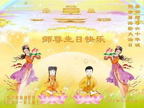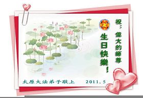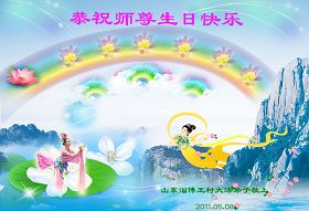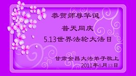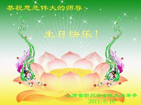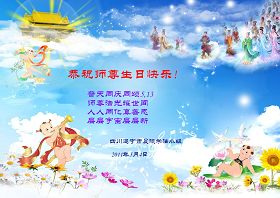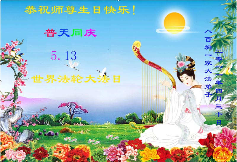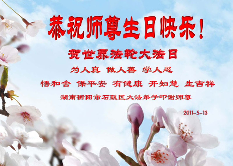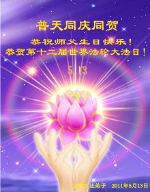 【明慧网二零一一年五月十二日】每年的5月13日,世界各地的法轮大法弟子,都向明慧网寄来贺卡贺词,恭贺师尊华诞,并庆祝“世界法轮大法日”。今日明慧网发表了中国大陆各地(东北、华北、西北、西南、华中、华南、华东)大法弟子发给李洪志师父和“5.13”世界法轮大法日的祝贺。以下是部份贺卡集锦。