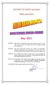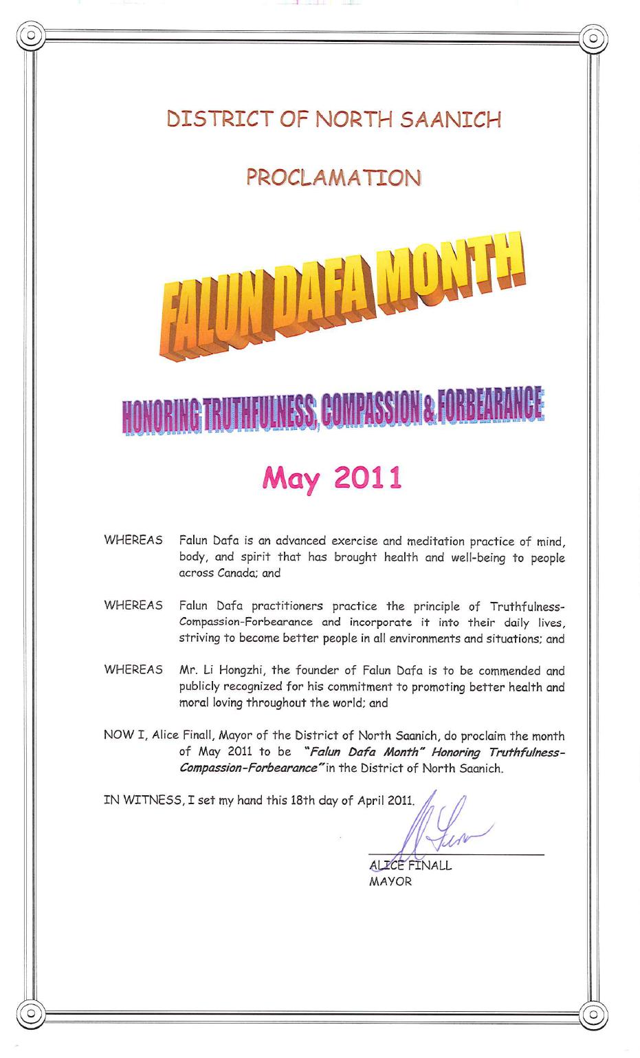 因此,我,艾丽丝•法诺(ALICE FINALL),萨尼奇北部地区市长,在此宣布二零一一年五月为萨尼奇北部地区“法轮大法真善忍月”。