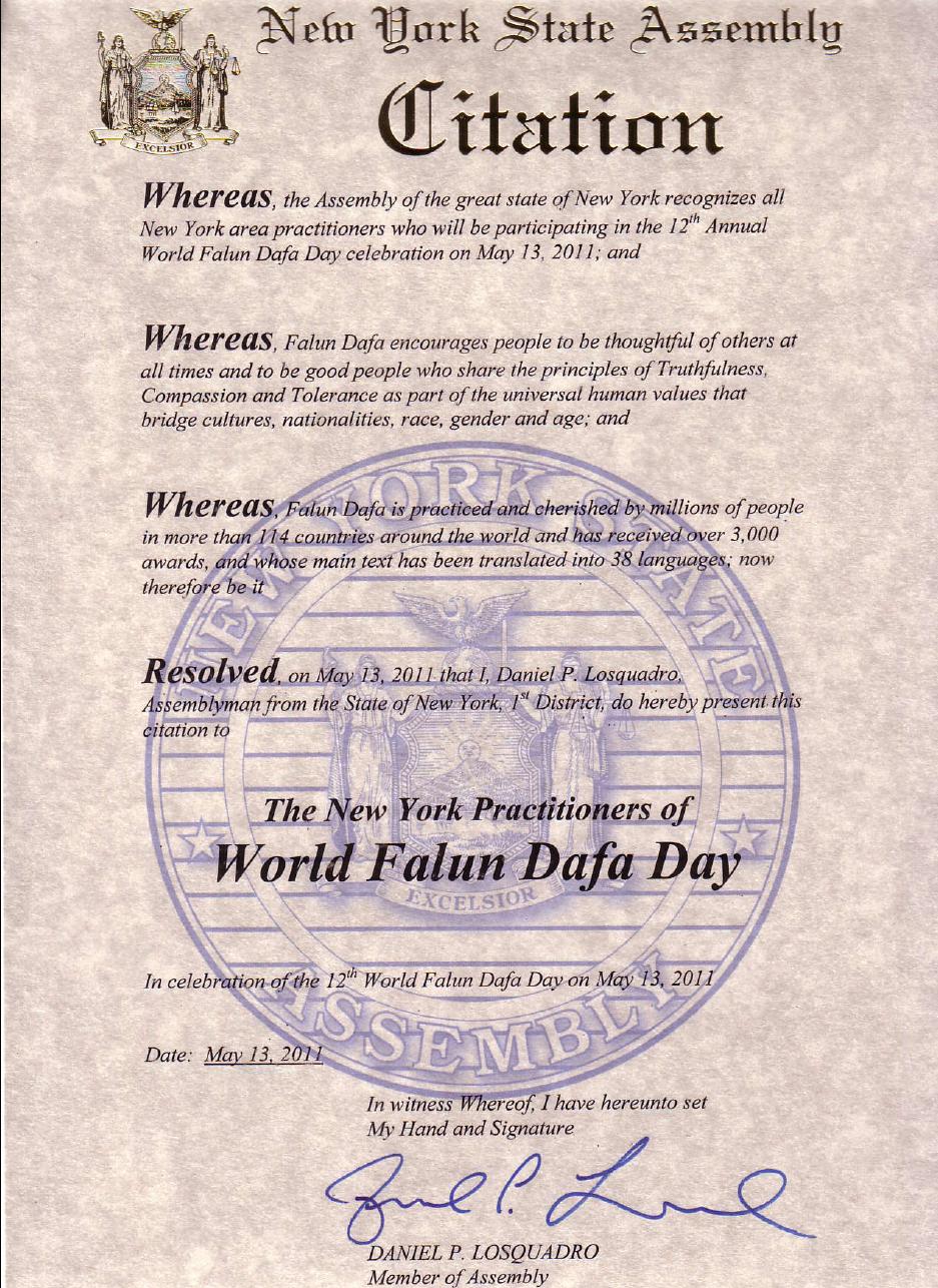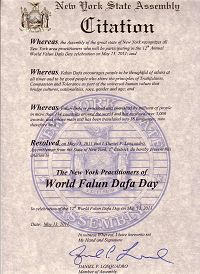 鉴于,杰出的纽约州众议院赞赏纽约州所有的(法轮大法)修炼者将要在二零一一年五月十三日庆祝第十二届世界法轮大法日;并且
