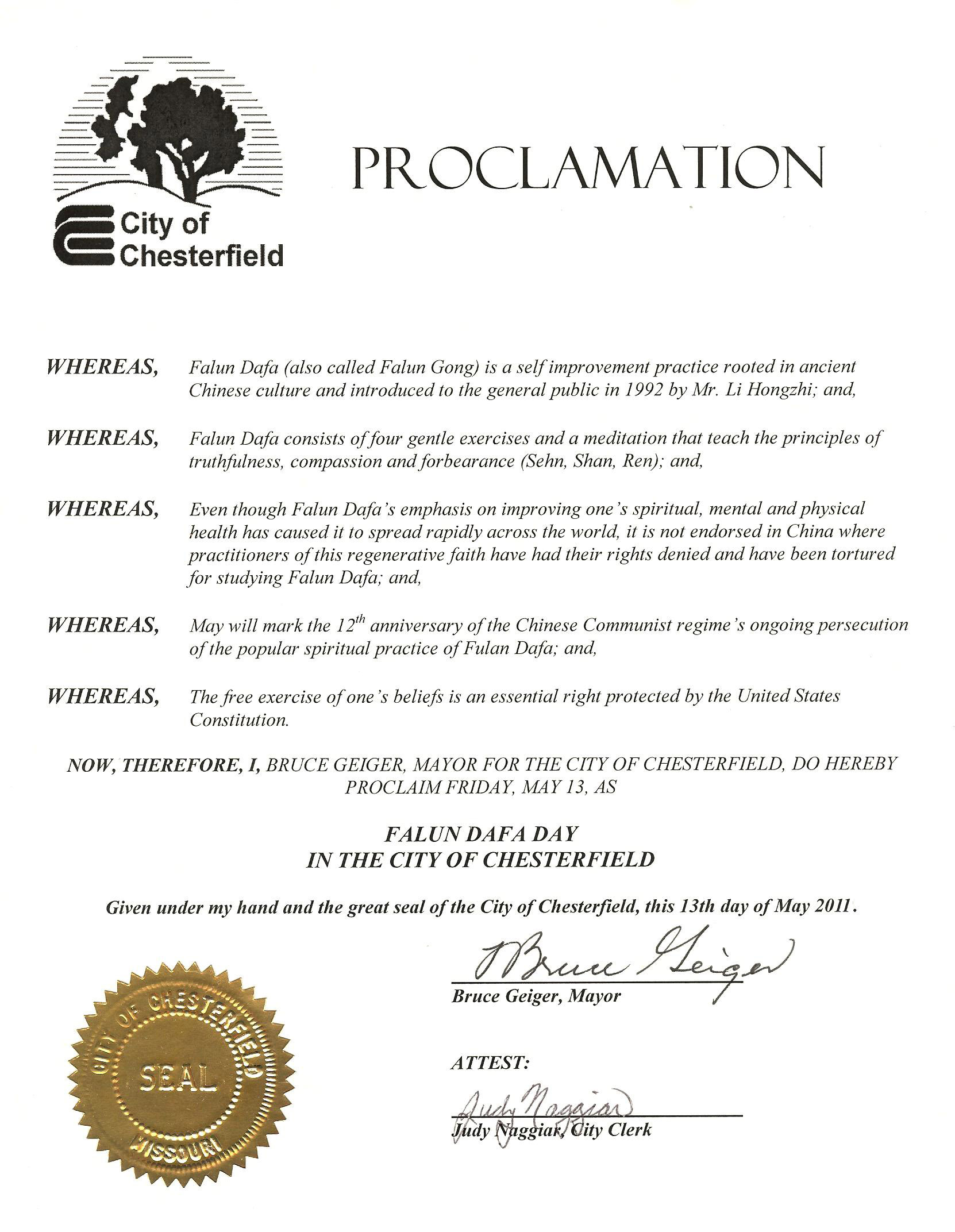 鉴此,我,切斯特菲尔德市长布鲁斯•凯格(Bruce Geiger)宣布二零一一年五月十三日为: