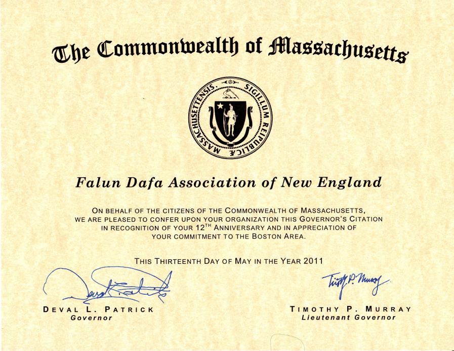 为表彰你们成立十二周年以及感谢你们对波士顿地区的付出﹐我们很高兴代表麻州州民授予贵协会州长褒奖。