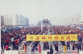 ![]() 1999年7月20日前,双城乡镇法轮功学员在承旭门前集体炼功洪法 |