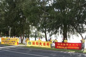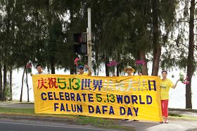 五月十三日下午,法轮功学员们在海滨路路旁展开“庆祝五一三世界法轮大法日”,“法轮大法好”及“世界需要真善忍”等大型横幅,向人们介绍法轮大法的美好。大法弟子们手拿鲜花,听着普度、济世,面带微笑向过往的车辆及行人挥手,并派发真相传单及纸折莲花,告诉人们“法轮大法好!”。民众也被这欢乐气氛所感染,鸣着喇叭表示欢庆。