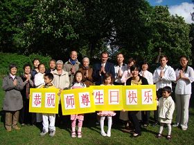 ![]() 法国法轮功学员齐声道:“法轮大法好,祝师父六十岁生日快乐!” |