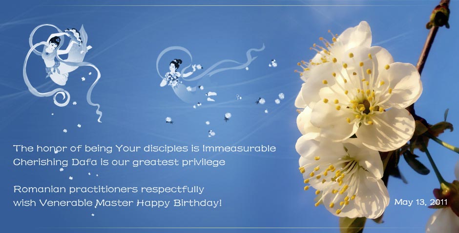 我们两个都是99年以前得法的弟子,十几年的修炼中,深深感受到师父的慈悲,师恩浩荡,值此师父生日之际,弟子叩拜师尊。遥祝师尊生日快乐。助师正法,救度更多众生,是弟子的心愿,再次深深感谢师父的救度洪恩。