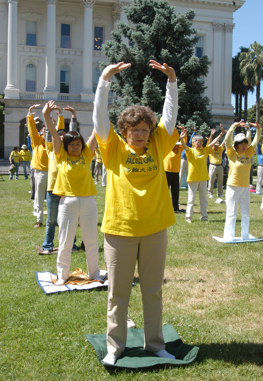 ![]() 郭恩作(左二)在加州州府大楼前参加集体炼功。 |