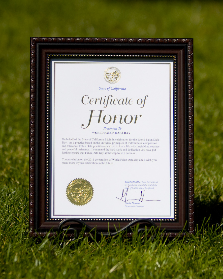 当天,加州副州长纽森发来致信祝贺,褒奖法轮大法日。他在贺信中说:“本人谨代表加州政府,和各位共同庆祝世界法轮大法日。法轮大法的修炼者遵循真、善、忍的宇宙真理修炼,并将生命致力于追求不屈的勇气及和平的抗争。我赞扬各位在州府全心全意投入庆祝的法轮大法日,活动圆满成功。”