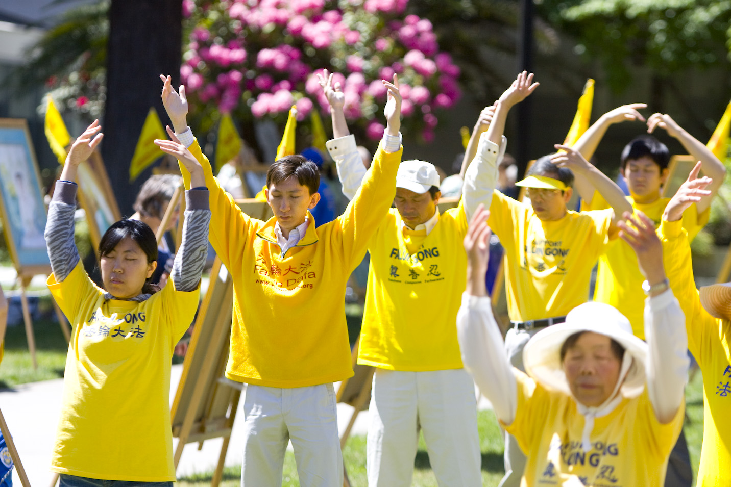 在炼功的人群中,有一位身穿印有“法轮大法”黄色T恤衫的青年,身影高挑,神清气爽。他就是郭恩作,是一位三十岁不到的年轻工程师。曾在大陆被非法关押、迫害的他说,国内和国外的环境,反差实在是太大了,“每次参加这种大型户外的活动,我总感到无比激动。我觉得能让世人看到法轮功学员的精神面貌很重要。”