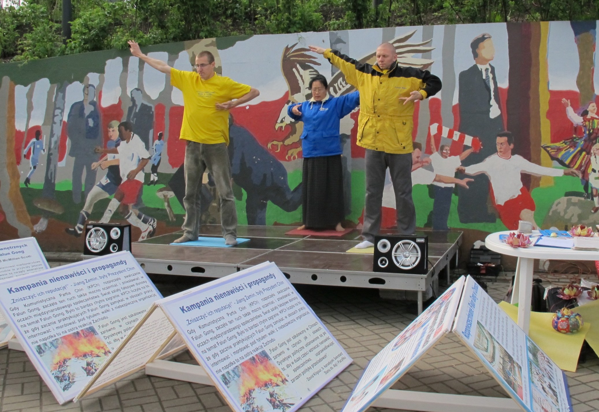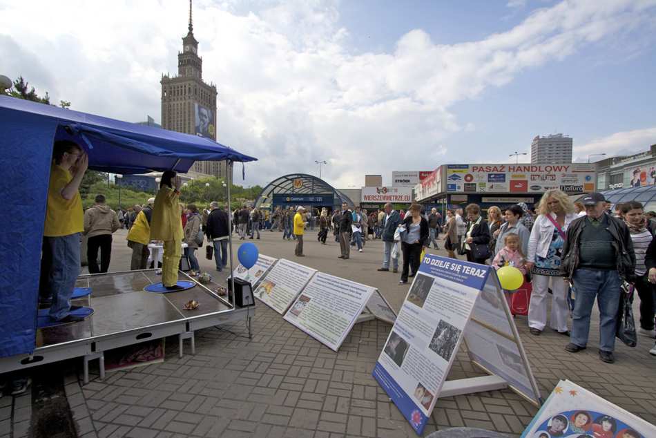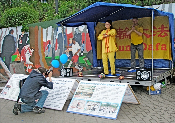 学员们在广场上支起展台,展板上是迫害发生前在中国大陆壮观的法轮大法炼功场面及法轮功五套功法图解。学员们随着祥和平缓的炼功音乐示范功法。展台上摆放着波语《转法轮》、象征修炼人高尚品格的纸莲花、印有“法轮大法好”字样的黄色和蓝色的气球。
