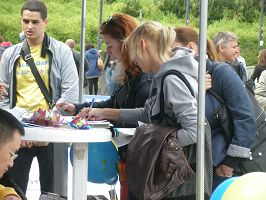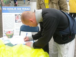周五的早晨正是人们上班的高峰时间,法轮功真相展板和功法示范吸引了一批又一批的波兰人驻足观看和拍照,人们争相索取法轮大法真相资料并仔细阅读。很多波兰人在下班后,再次来到展台前向法轮功学员咨询,对法轮功在中国受到残酷迫害感到震惊和无法理解。有数百人当场签名,强烈谴责中共迫害法轮功。
