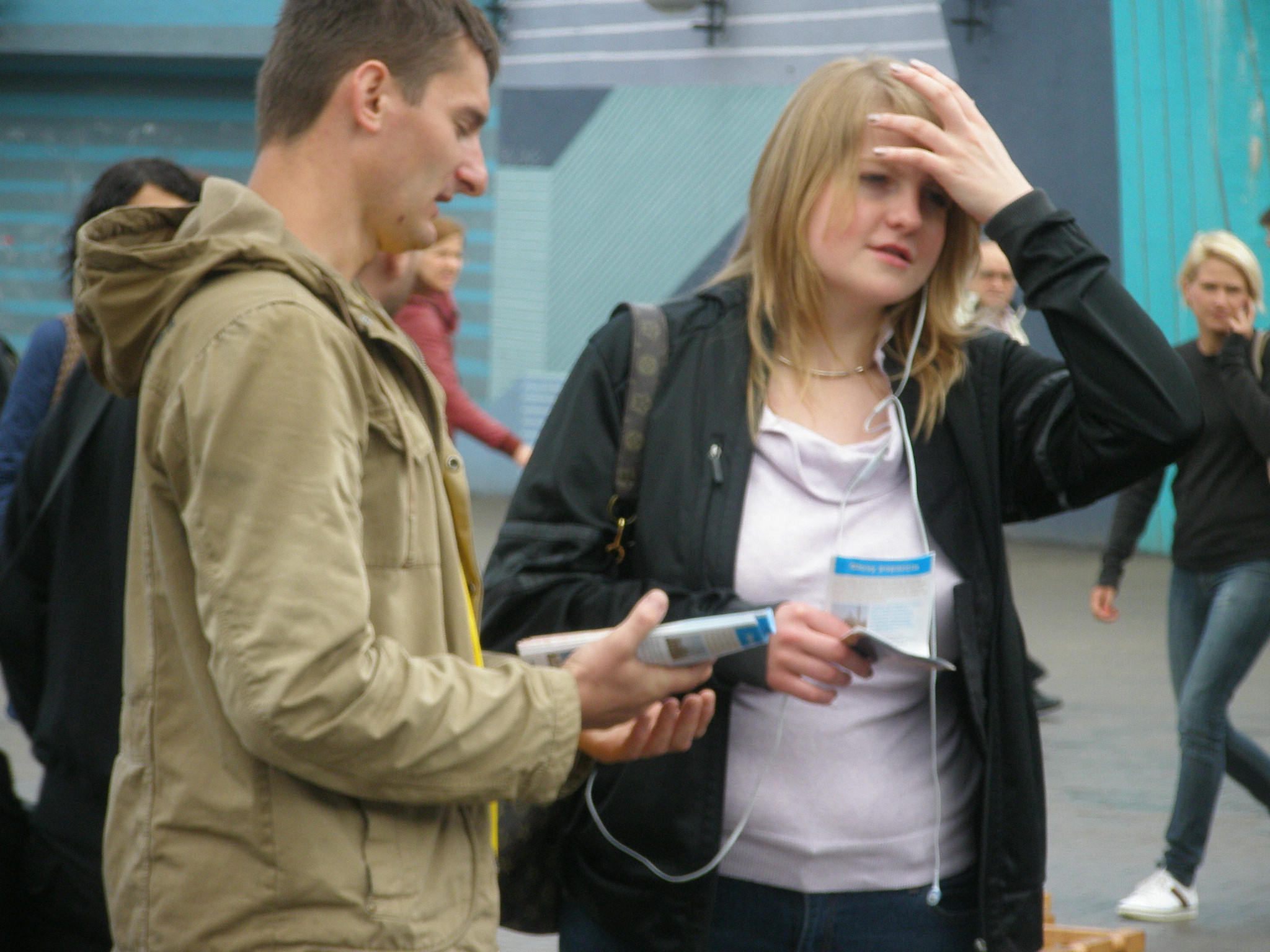一位年轻的姑娘在听法轮功学员介绍中共对法轮功迫害时,一手不由自主地抬起盖住额头,甚至连眼睛都想蒙起来,“这太邪恶了,共产党是这么邪恶的东西,我庆幸波兰没有了共产党,庆幸我有了解法轮功真相的自由。”