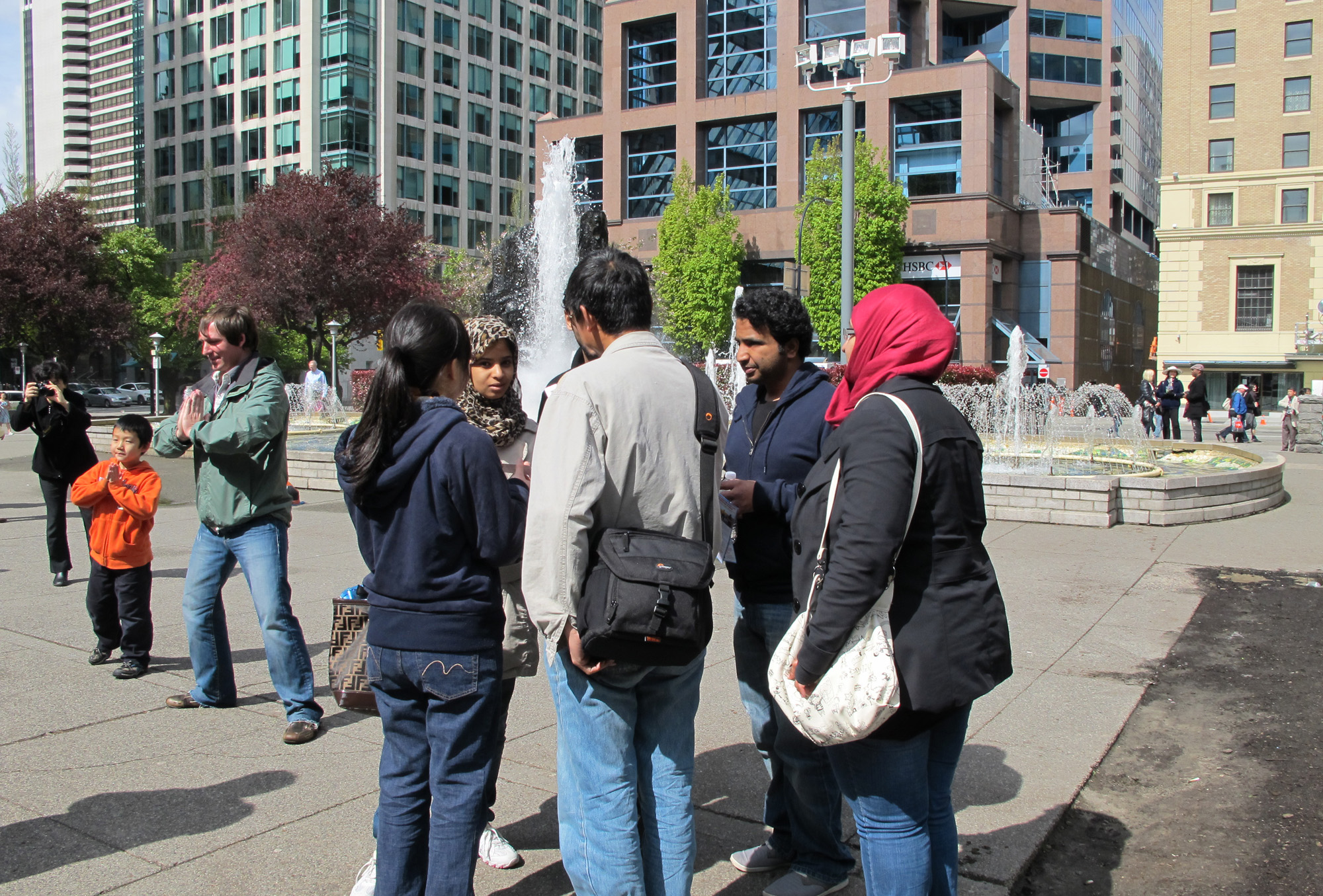 一对来自加拿大卑诗省基隆拿市(Kelowna)的中年夫妇,一人拖着一个大行李箱,看到法轮功学员的炼功场面,就不走了,表示要学功。西人学员布莱德(Brad)就教他们炼打坐,并简单讲了功理功法。他们表示一定要炼法轮功,最后他们要了布莱德的电话,以便继续联系。